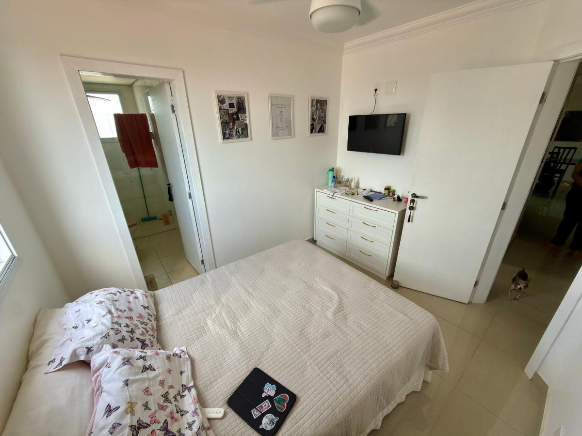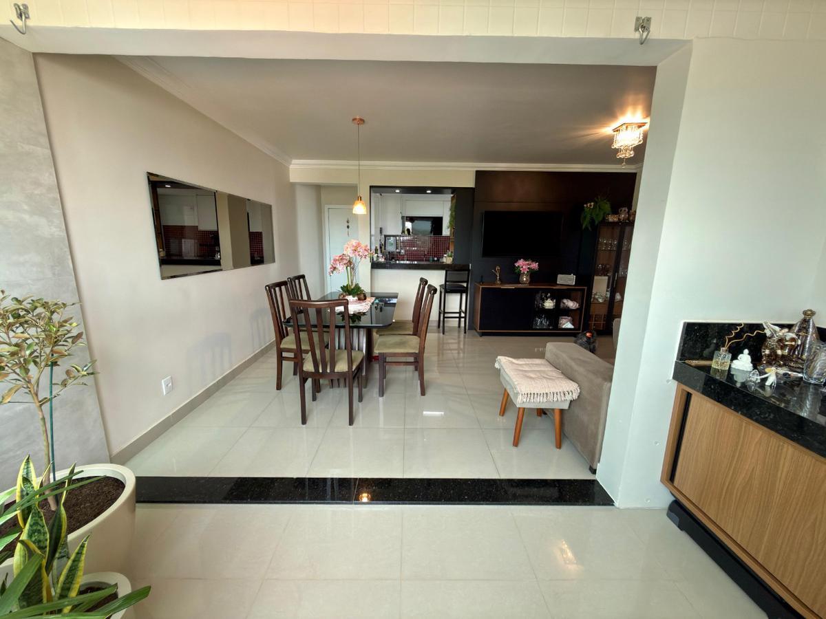 A sala é ampla, bem iluminada, com painel planejado para TV e integração com uma agradável varanda, ideal para momentos de descanso.