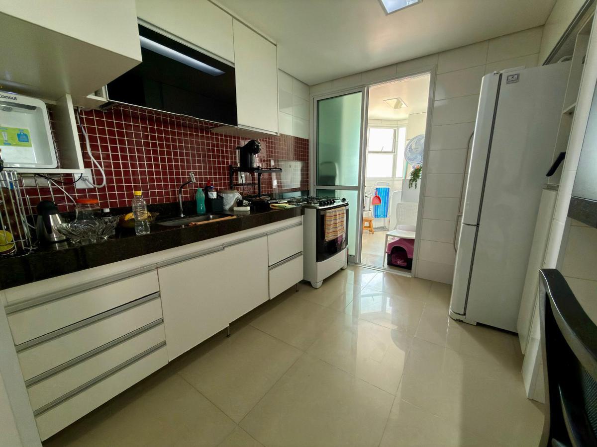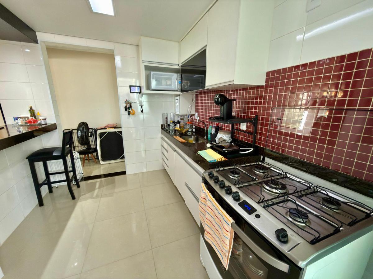 A cozinha estilo americana é totalmente planejada, com armários funcionais, conectada à área de serviço também planejada, garantindo melhor aproveitamento do espaço.