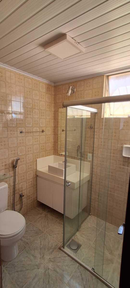 Banhos social e da suíte com box em vidro temperado e cuba sobre a bancada, suíte com piso e paredes em porcelanato.