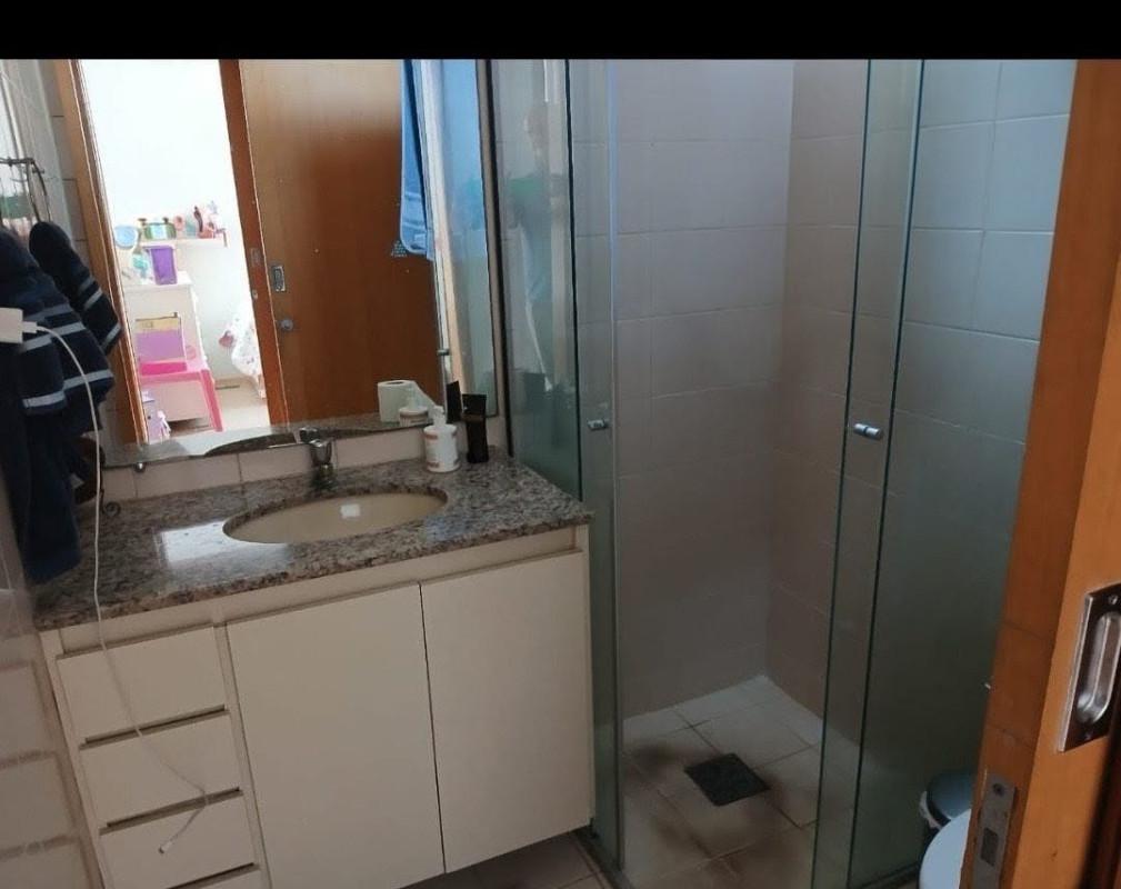 Um banho social com box blindex bancada em granito armário.