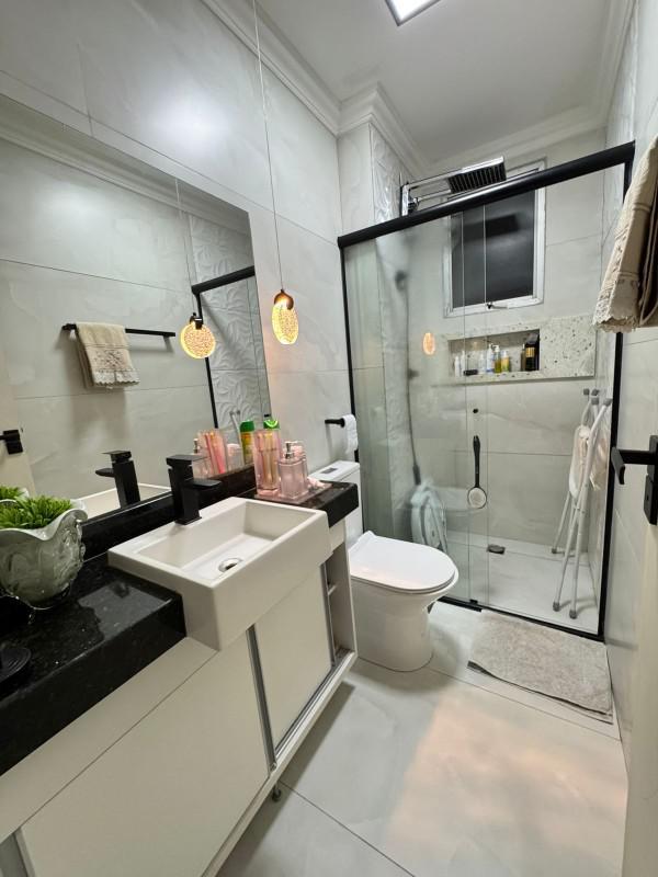 Banho social com bancada em granito e pia sobreposta, box em vidro temperado e nicho;