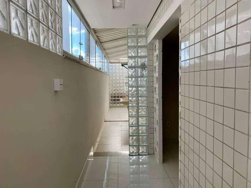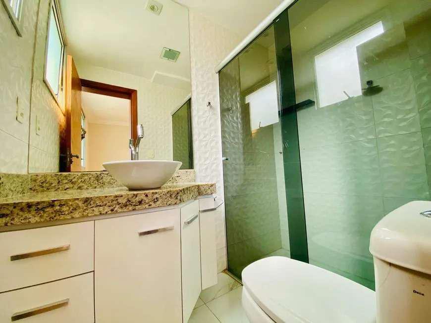 Banho Social: Banheiro social com bancada em granito, armário, espelho e box em blindex, piso em porcelanato.