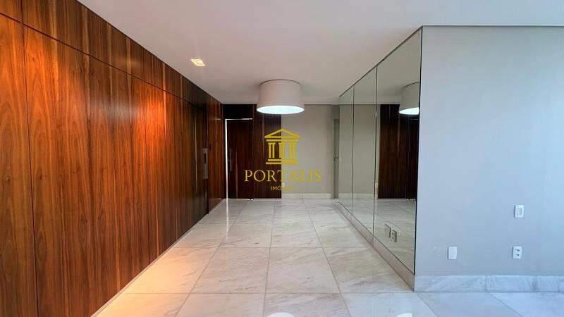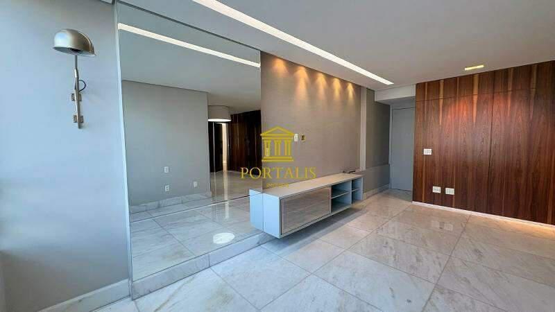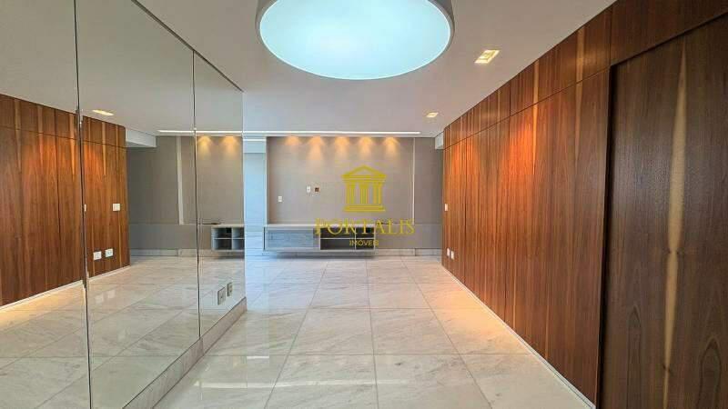 1 sala ampla e integrada para dois ambientes, com piso em mármore polido, teto rebaixado, iluminação toda planejada, decorada com espelho e móveis planejados