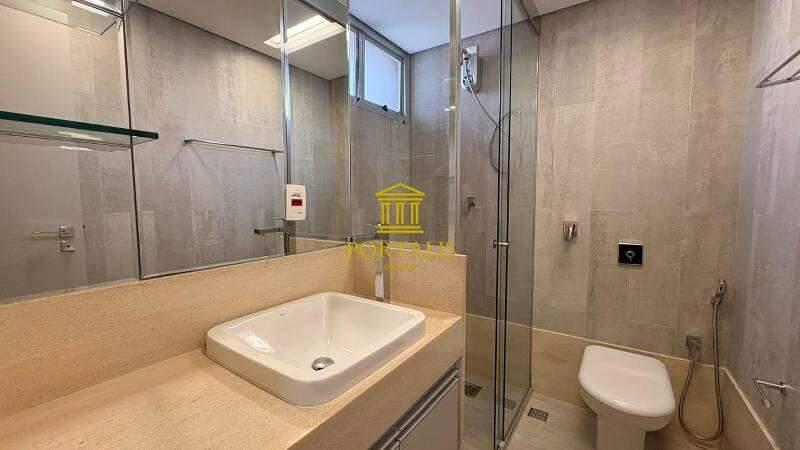 Banheiro social com bancada em mármore, espelho, armários planejados e box em blindex