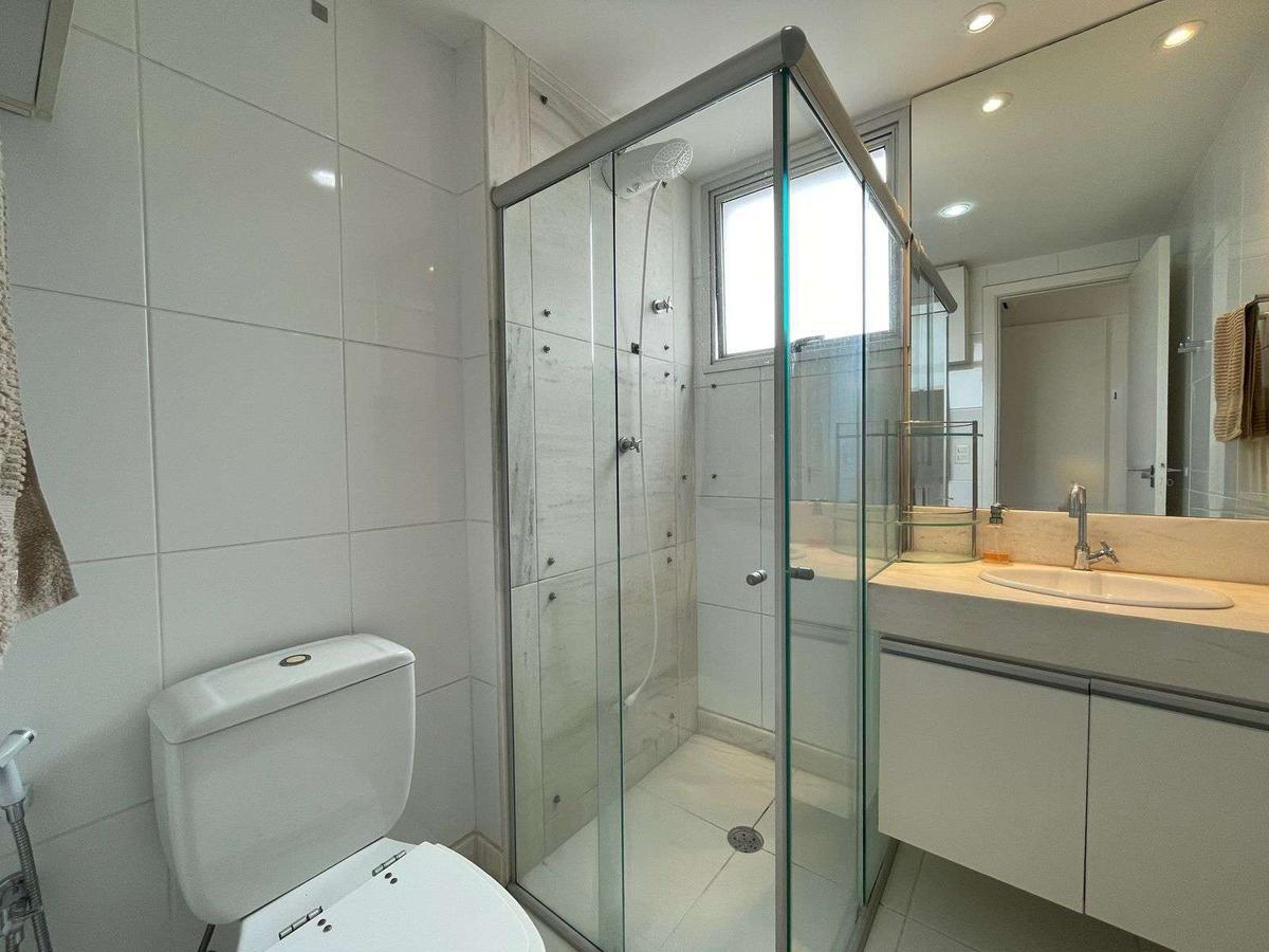Banheiros (social e suíte) com excelente acabamento, armários, espelhos e box em blindex.