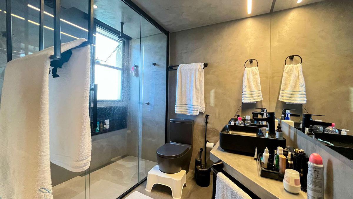 3 quartos espaçosos com piso em vinílico de madeira, todos com armários planejados, iluminação planejada, sendo duas suítes, uma com móveis planejados, bancada em granito, espelho, armários planejados e box em blindex, a outra com banheira no quarto, closet, teto rebaixado, iluminação planejada, espelho, armários planejados e box em blindex
