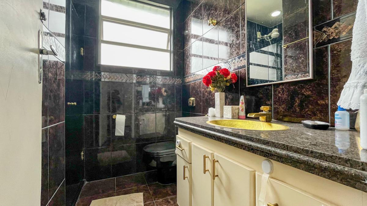 Banheiro Social: Com bancada em granito, armário, box em vidro temperado e espelho.