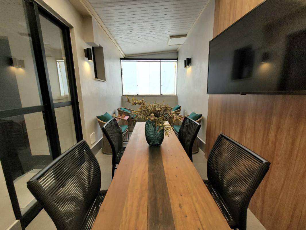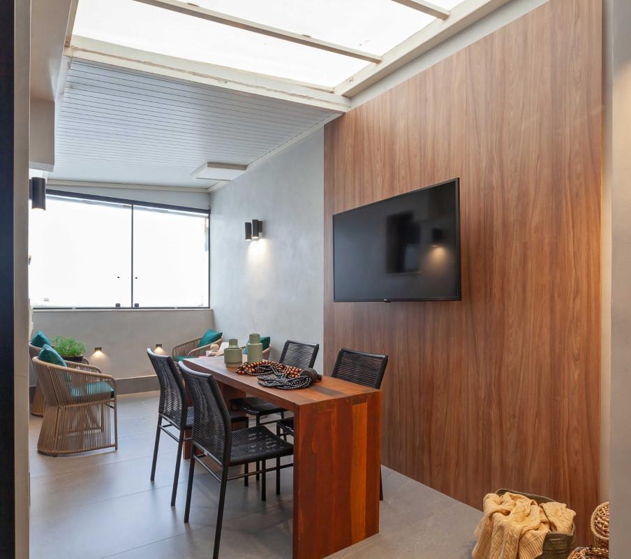 - Área externa com teto retrátil, iluminação especial, blindex e piso em porcelanato, com local para churrasqueira.