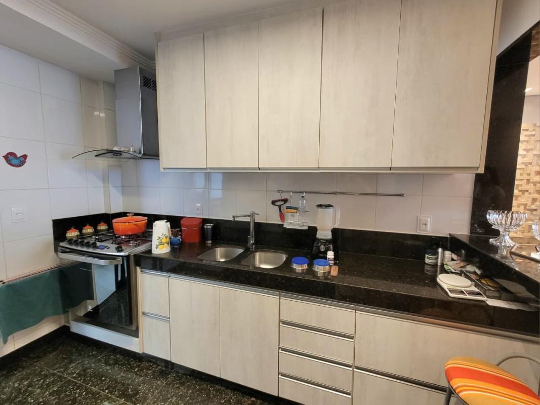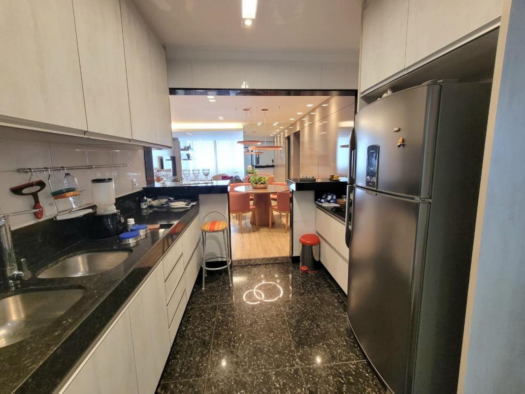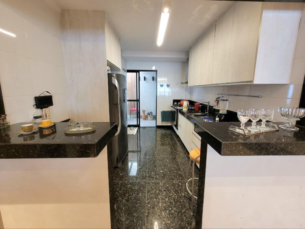 - Cozinha americana com armários planejados, bancadas em granito, piso em granito e revestimento em cerâmica.