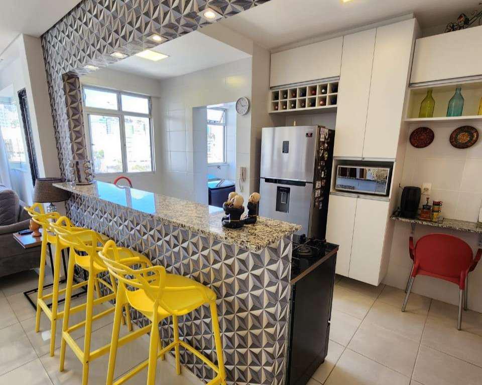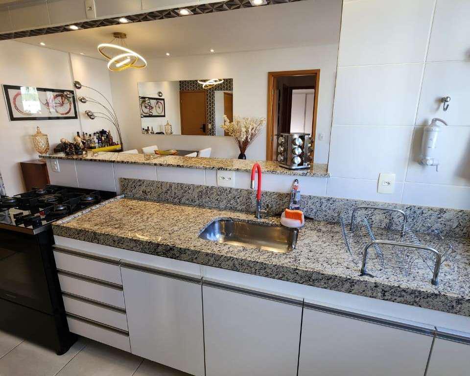 Cozinha ampla com bancada em granito estilo americana e armários planejados