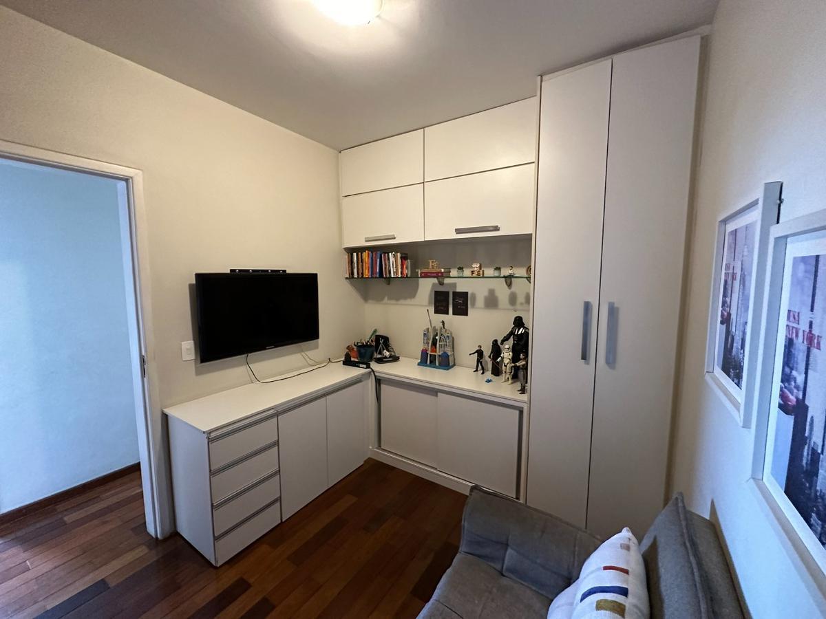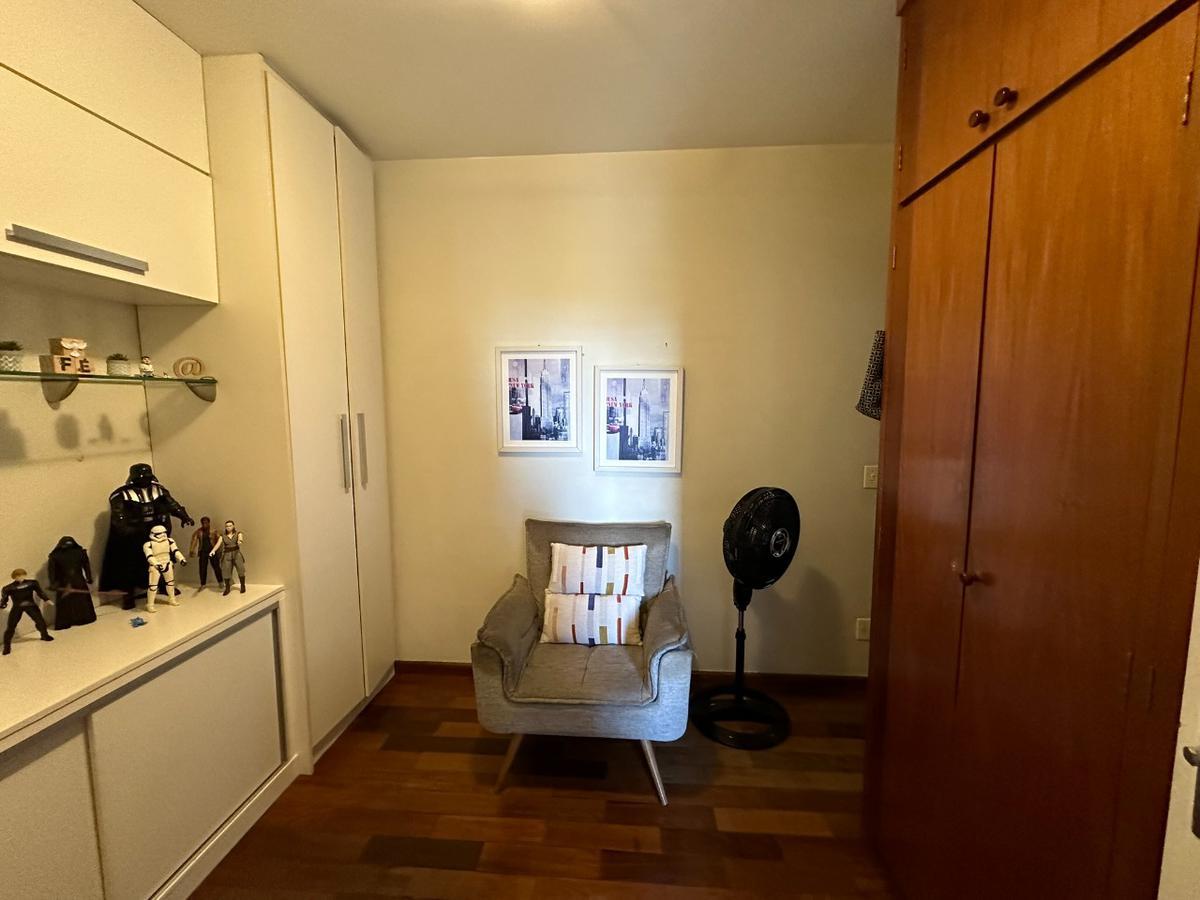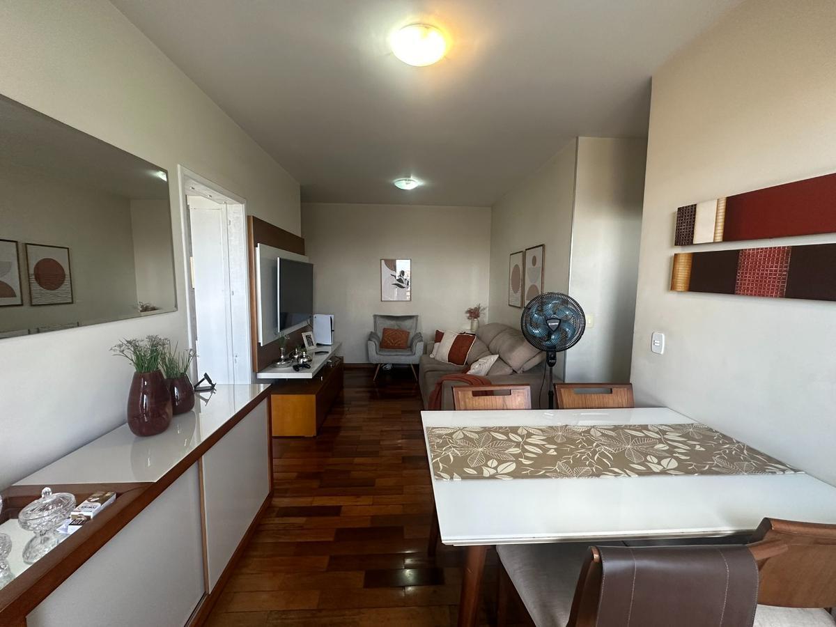 O apartamento é composto por 3 quartos, todos com armários embutidos e piso em tacão de madeira. São 2 banheiros, sendo um social e uma suíte, ambos com box blindex. Os banheiros são revestidos em cerâmica, com bancadas em granito. A varanda, com piso em granito, é integrada à sala, que também apresenta o mesmo acabamento em tacão. A cozinha é equipada com armários planejados e a área de serviço é separada.