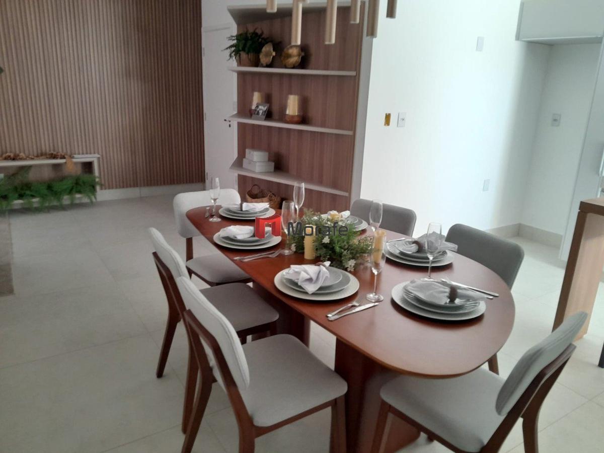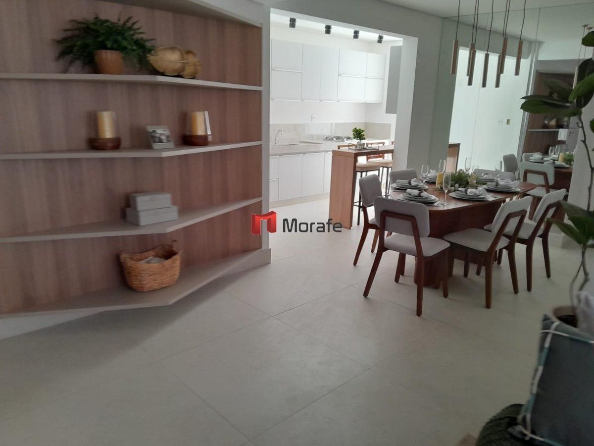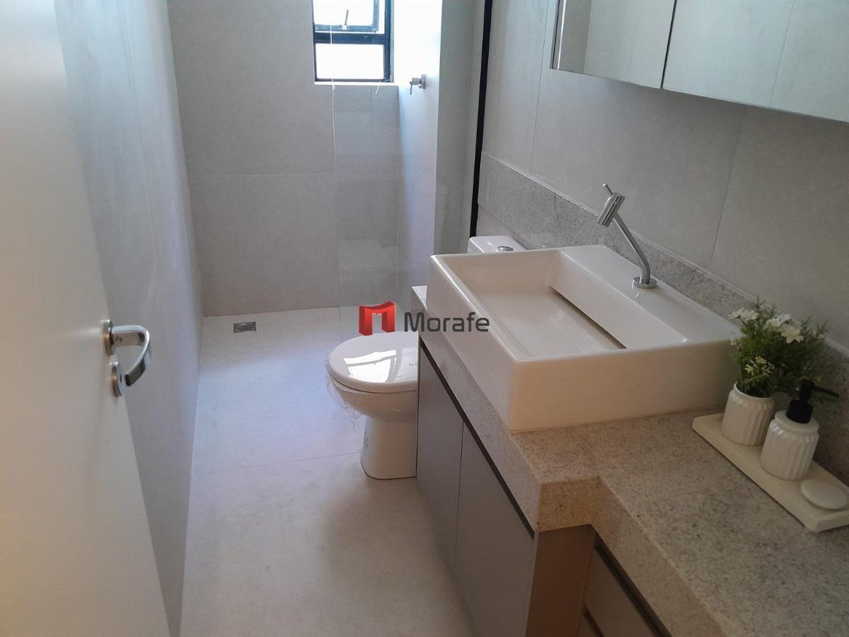 Apartamento com 3 quartos, sendo 1 suíte, com piso em porcelanato polido. Acabamentos de alto padrão, com bancadas em granito e janelas em esquadrias de alumínio anodizado. O prédio conta com elevador e a unidade possui 2 vagas de garagem.