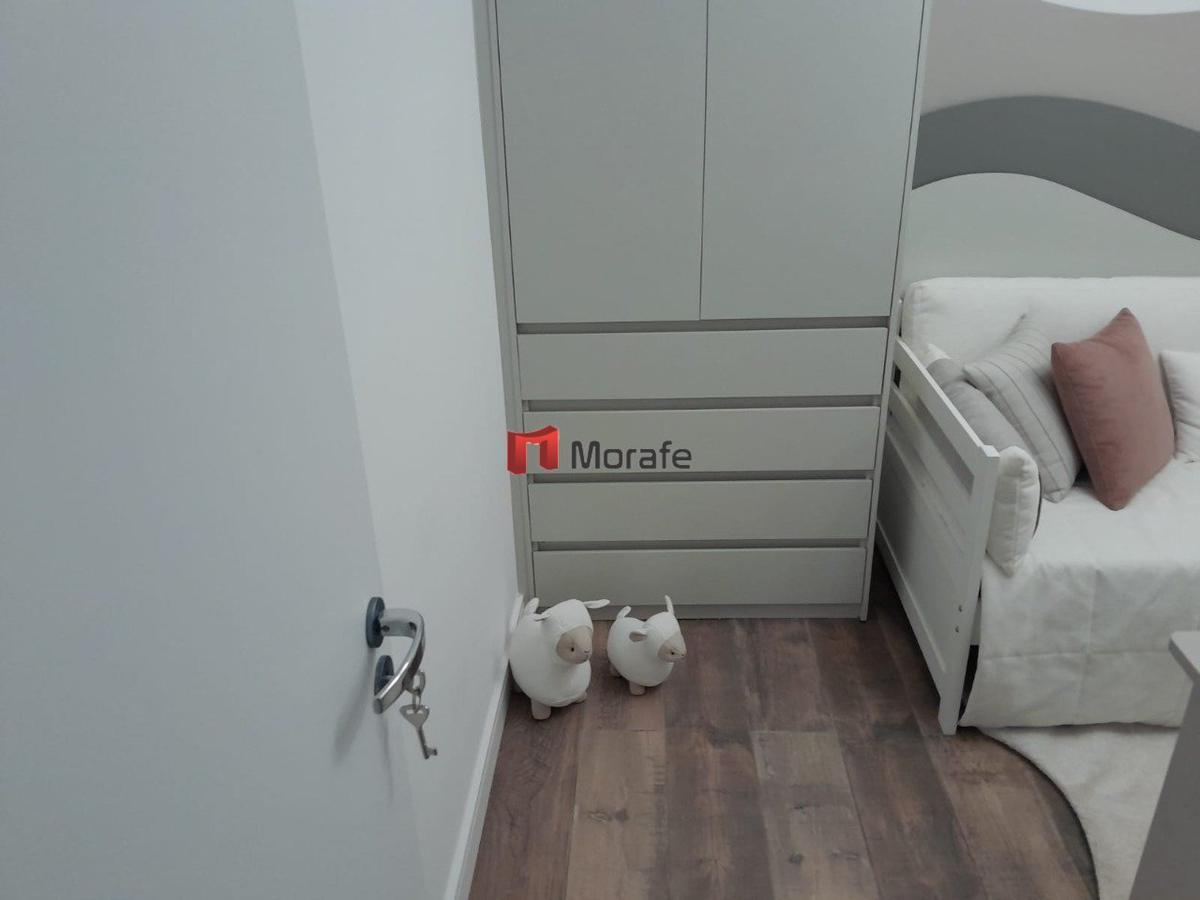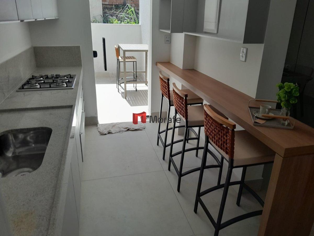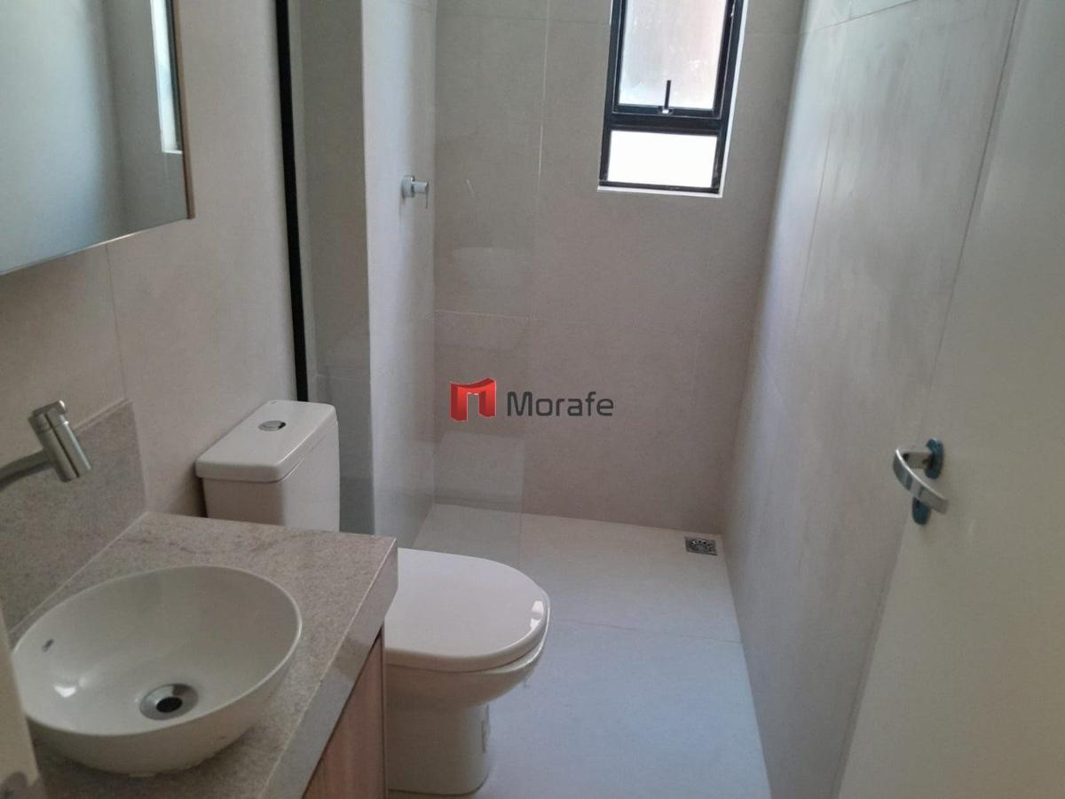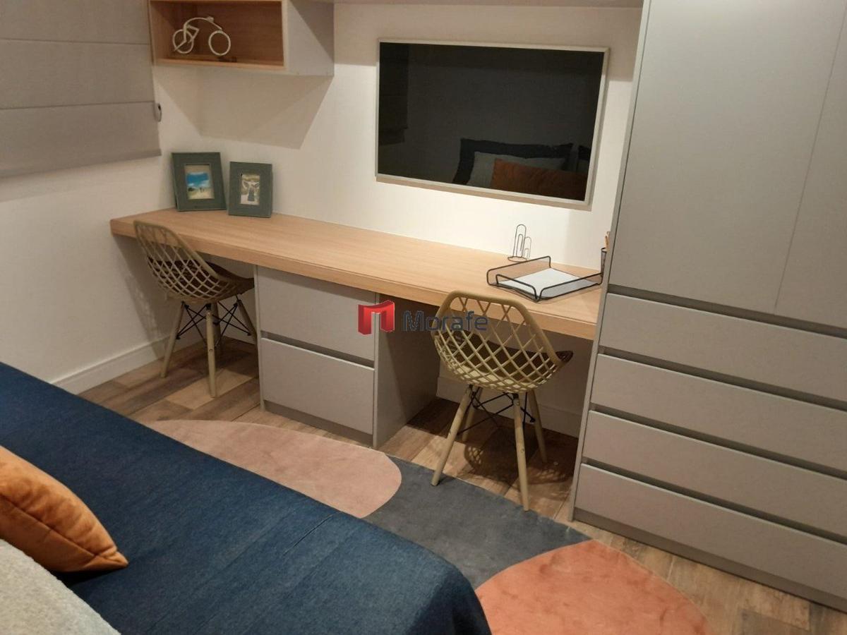 Apartamento com 3 quartos, sendo 1 suíte, com piso em porcelanato polido. Acabamentos de alto padrão, com bancadas em granito e janelas em esquadrias de alumínio anodizado. O prédio conta com elevador e a unidade possui 2 vagas de garagem.