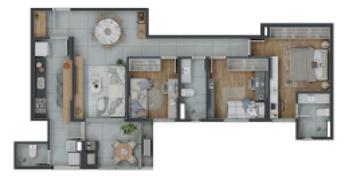 Infraestrutura: Porteiro físico e virtual 24 hrs; interfone; portão eletrônico; gás canalizado; elevadores panorâmico; varanda gourmet; salão de festas; espaço fitness; coworking; lavanderia; sala de massagem, SPA e salão; brinquedoteca; playground; espaço Kids; quadra de areia; quadra poliesportiva; quadra de tênis; piscina principal; piscina com prainha/ deck molhado; piscina infantil; piscina aquecida; sauna; pet place; espaço p/ carregamento de carro elétrico.