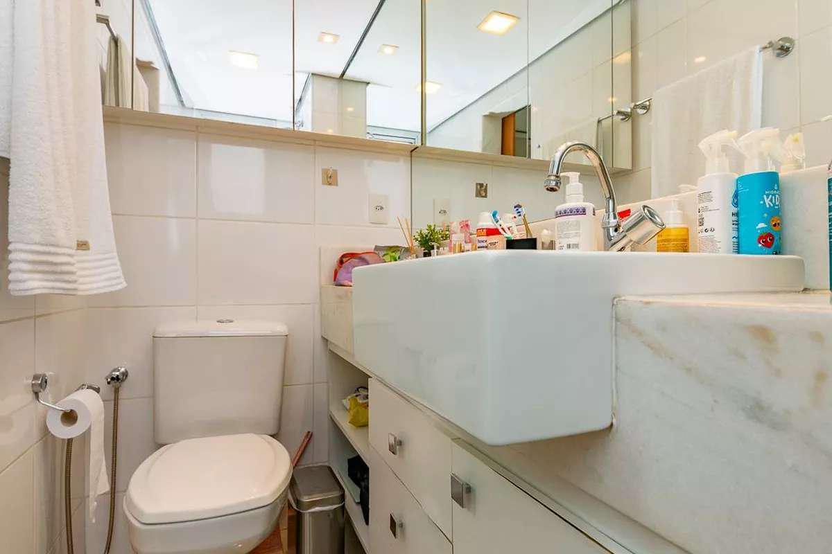2 banheiros sociais, sendo um com espelho, bancada em granito, armários e box em blindex, e outro localizado na área externa da área privativa