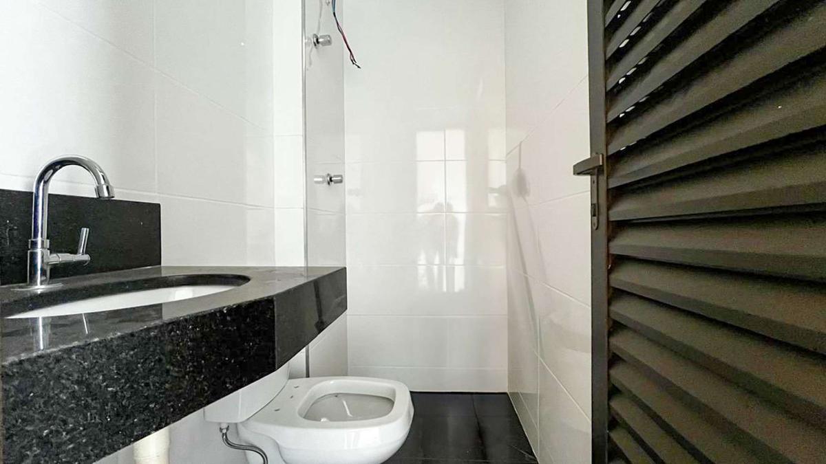 Banheiro social com pia em granito e piso em porcelanato.