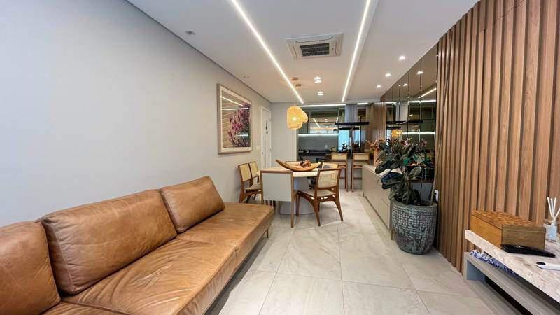 Sala ampla para 2 ambientes integrada à cozinha, piso em porcelanato