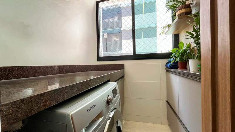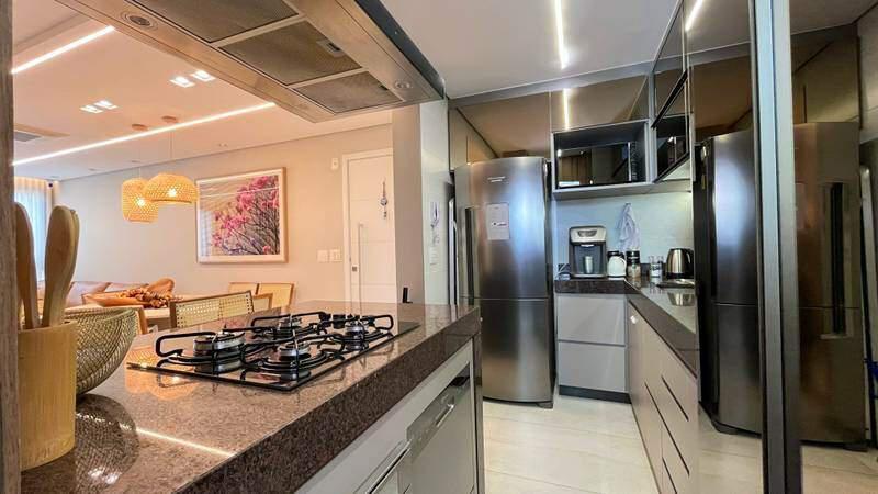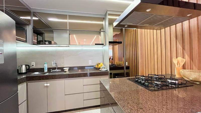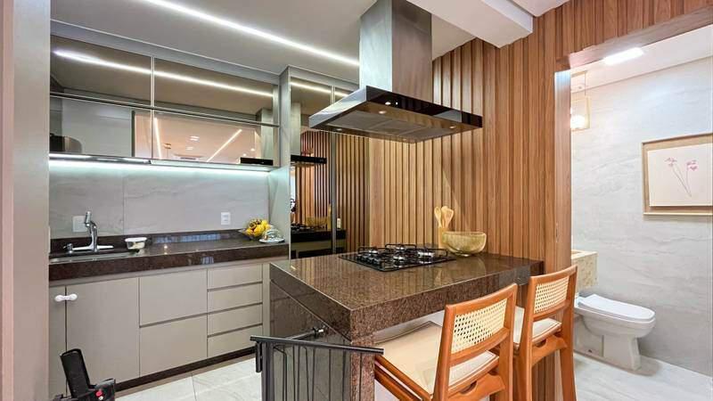 Cozinha funcional com bancada em granito, piso em porcelanato
