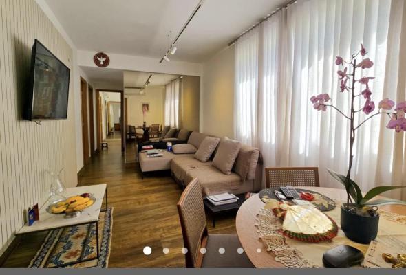 - Sala ampla para dois ambientes decorada, rebaixamento de teto, piso em porcelanato;