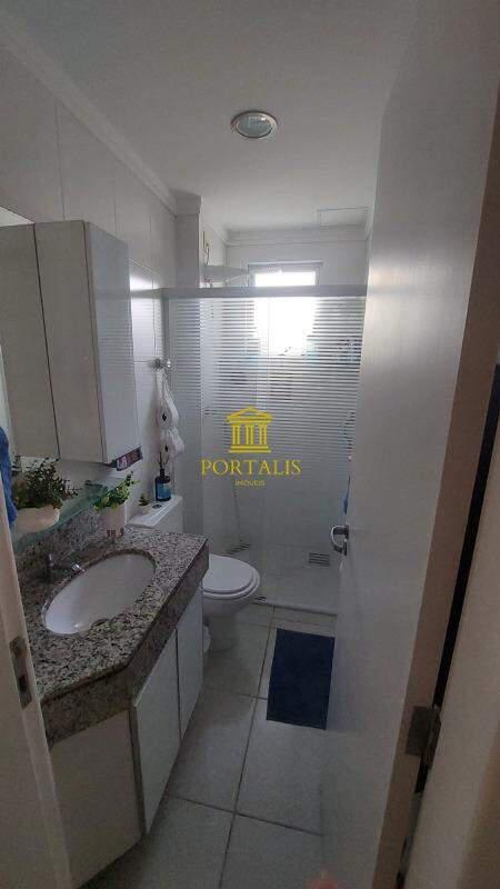Banheiro social com bancada em granito, armário e box
