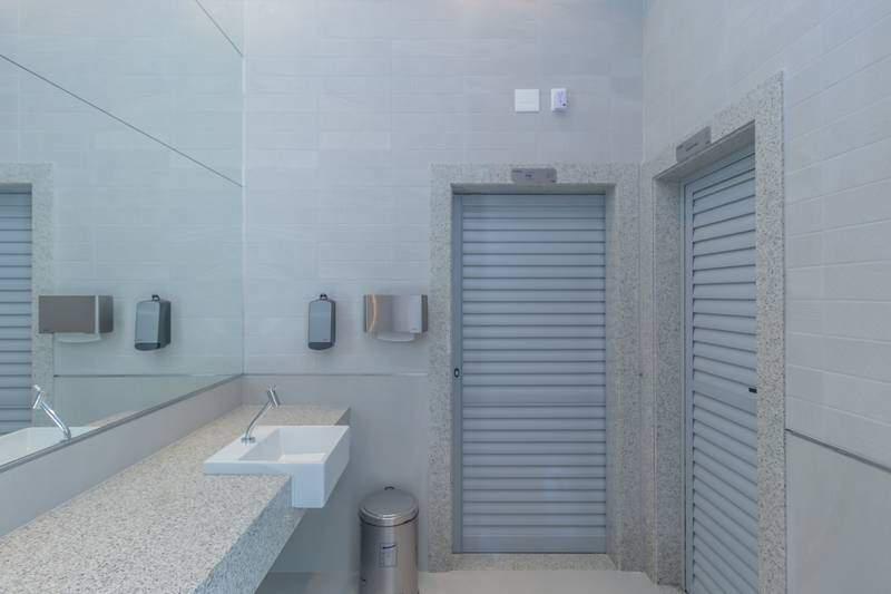 Banheiros (suíte, social e lavabo) com ventilação natural e acabamento em porcelanato.