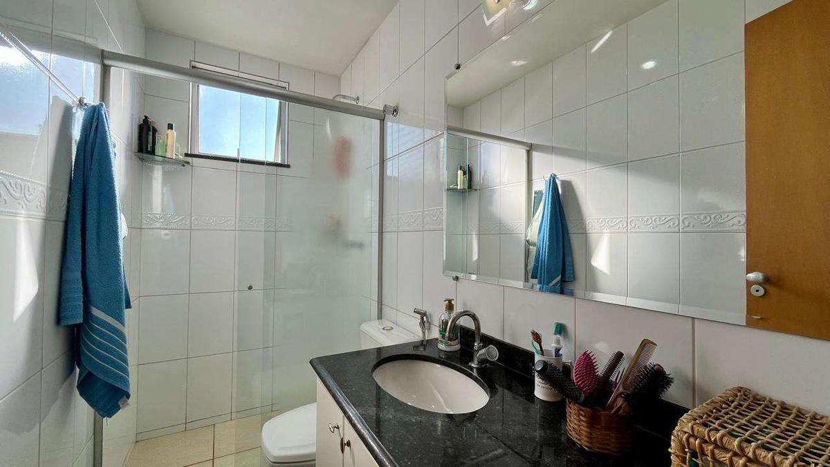 Banho social com bancada em granito, armário, espelho e box em blindex