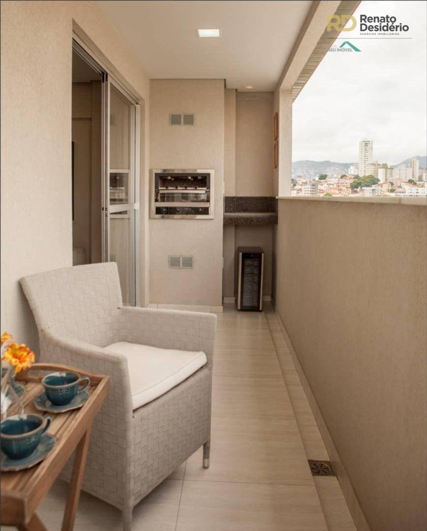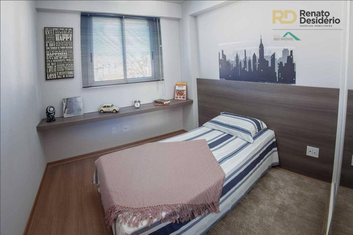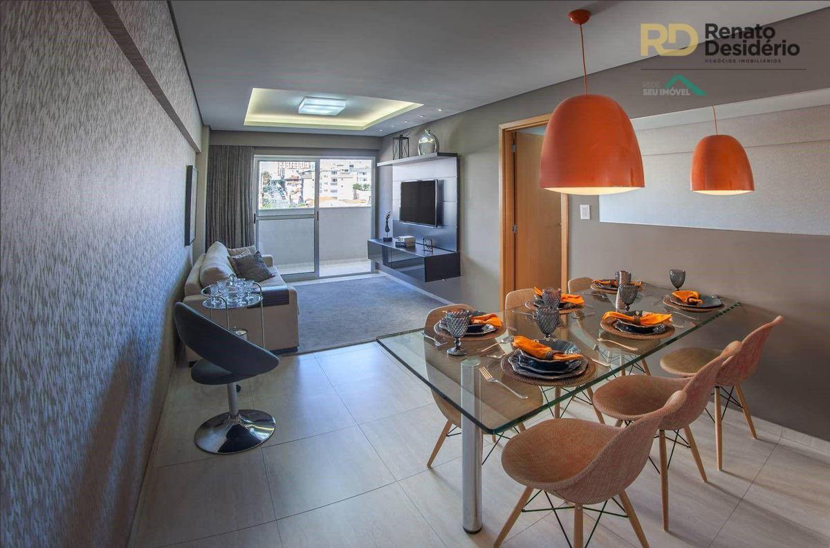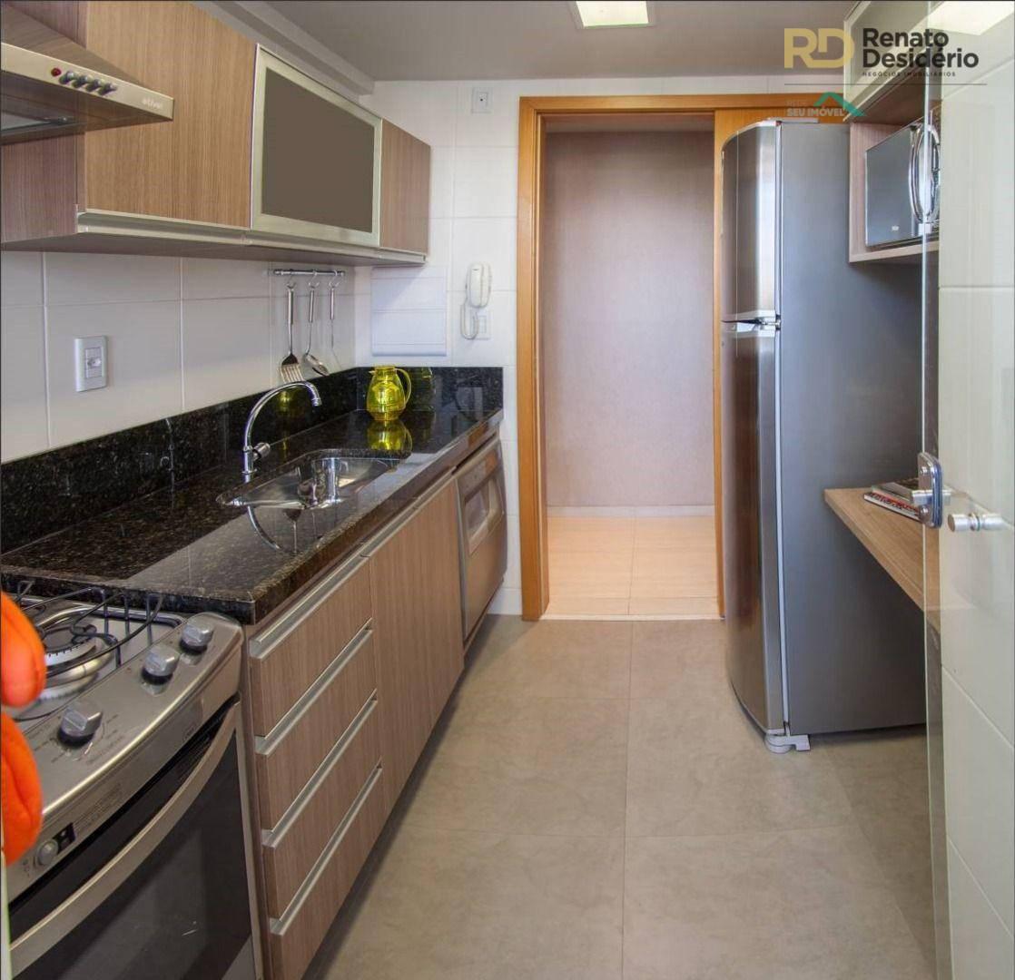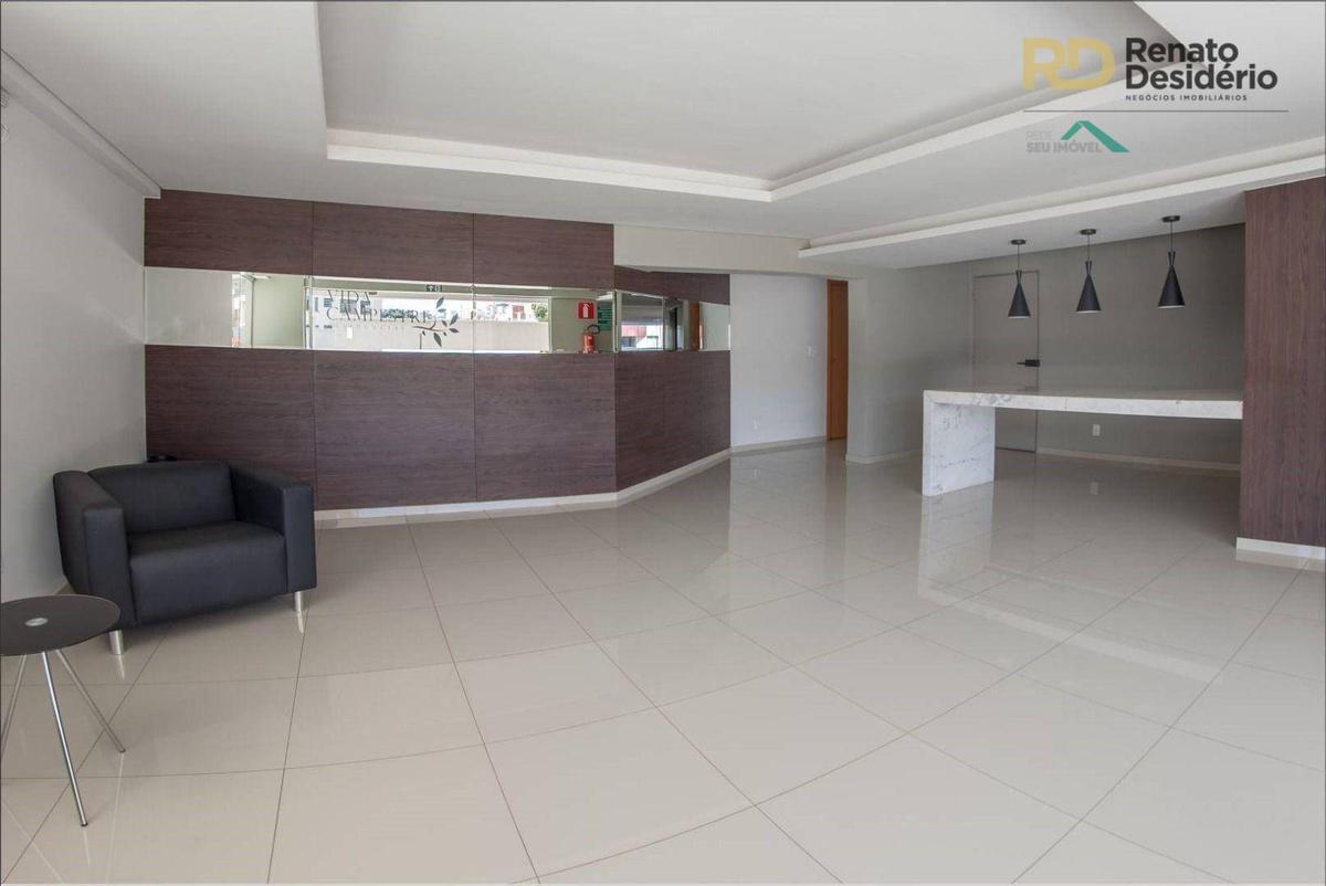 3 quartos com armários, sendo 1 com suíte com armário, sala com piso em porcelanato, banho social com armário, varanda gourmet com churrasqueira, cozinha gourmet com cook top e forno elétrico, bancada em granito, área de serviço, banho de serviço e 2 vagas.