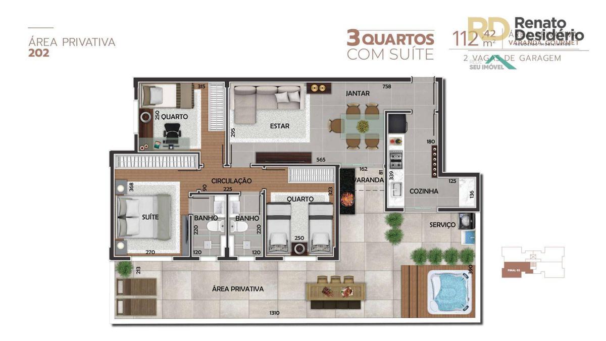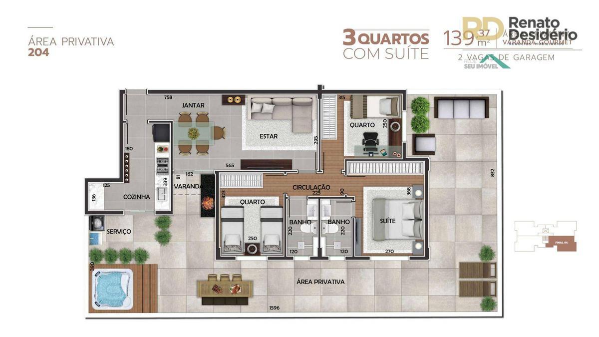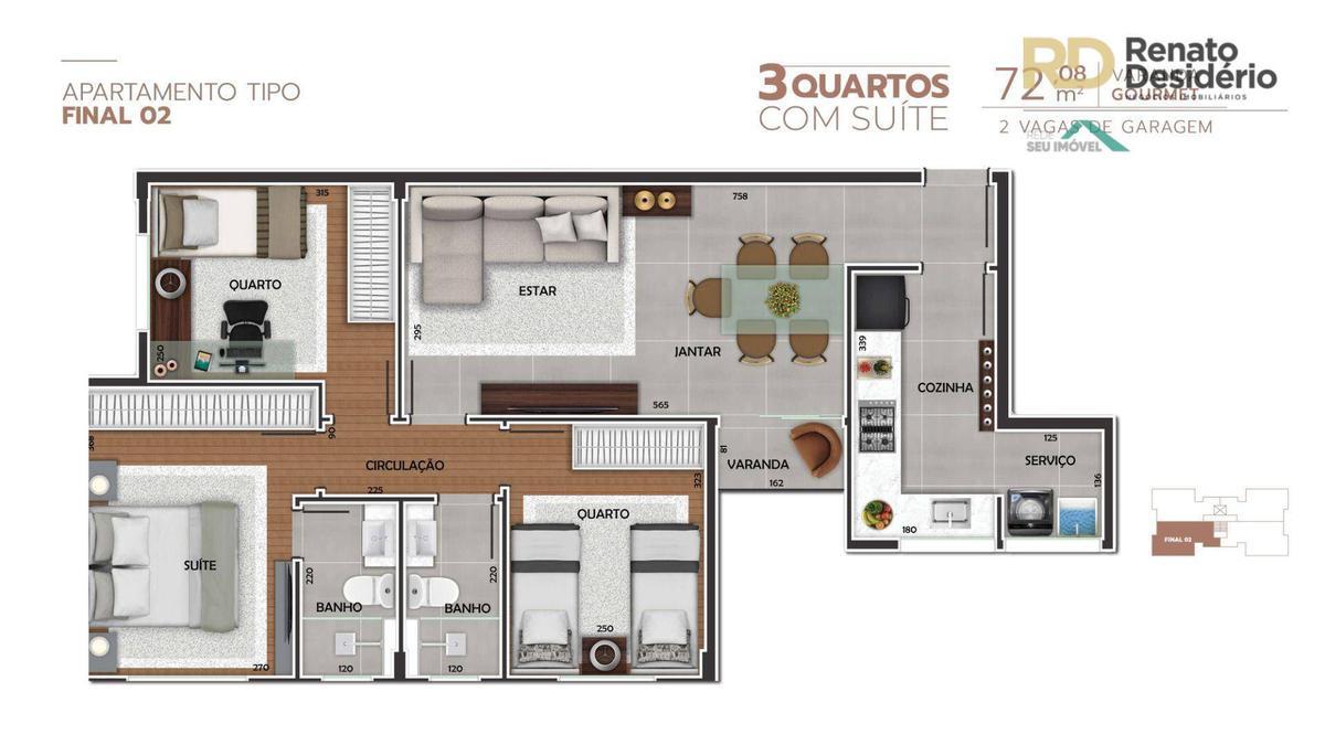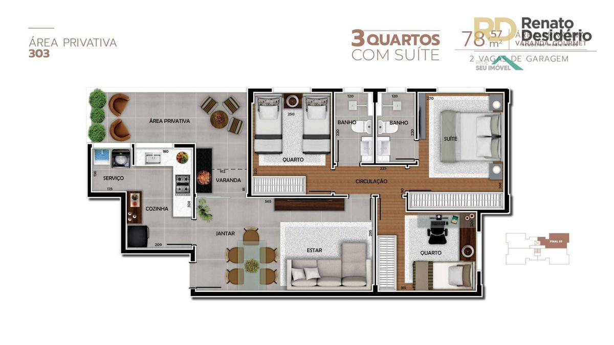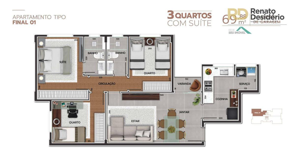 Apartamento: 03 quartos amplos com piso em laminado de tabua corrida, 02 banhos de luxo, piso em porcelanato, bancada de granito, sendo 01 suíte, salão para 02 ambientes, piso em porcelanato, varanda, cozinha com piso em porcelanato, bancada de granito, área de serviço.