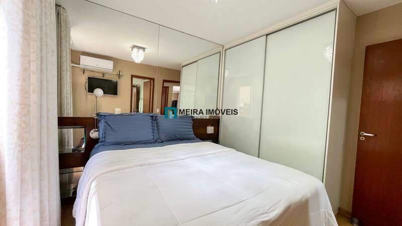 ¿ 3 quartos amplos com piso em vinílico de madeira, armários, sendo uma suíte decorada com espelho, iluminação planejada, espelho, bancada em granito e box em blindex