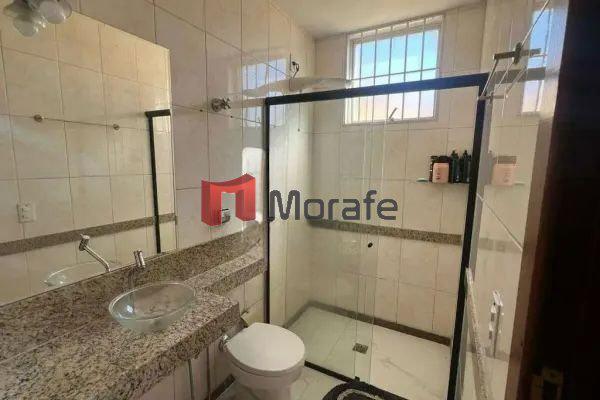 Banheiro social com pia em bancada de granito, armário planejado e box em blindex.