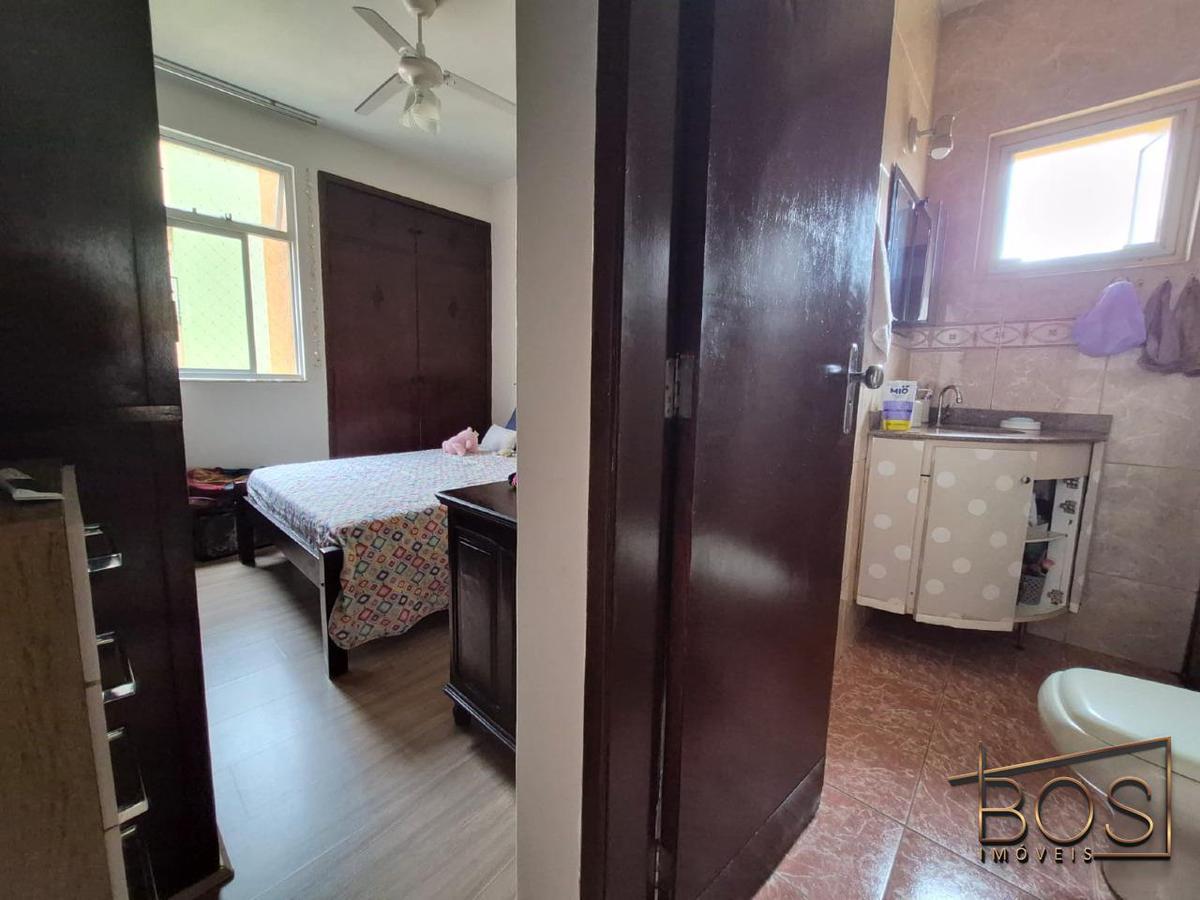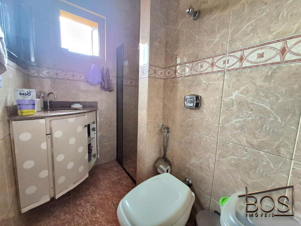 - Banheiro da suíte e banheiro social revestidos em cerâmica, ambos com armários e box