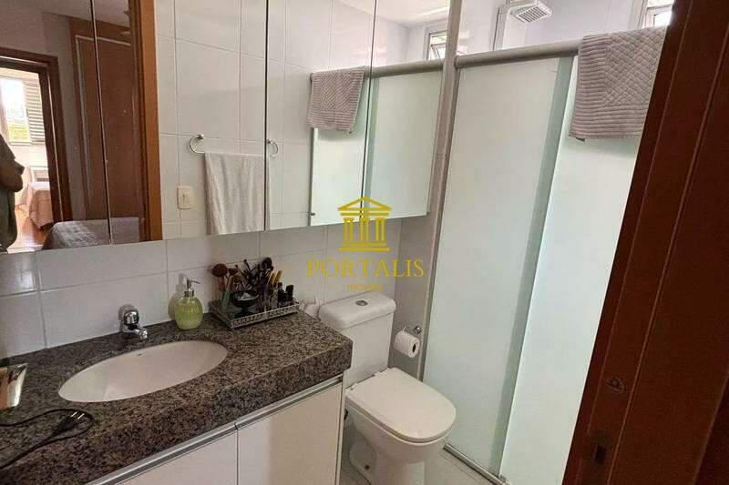 Banheiro social com bancada em granito, espelho, armários e box em blindex