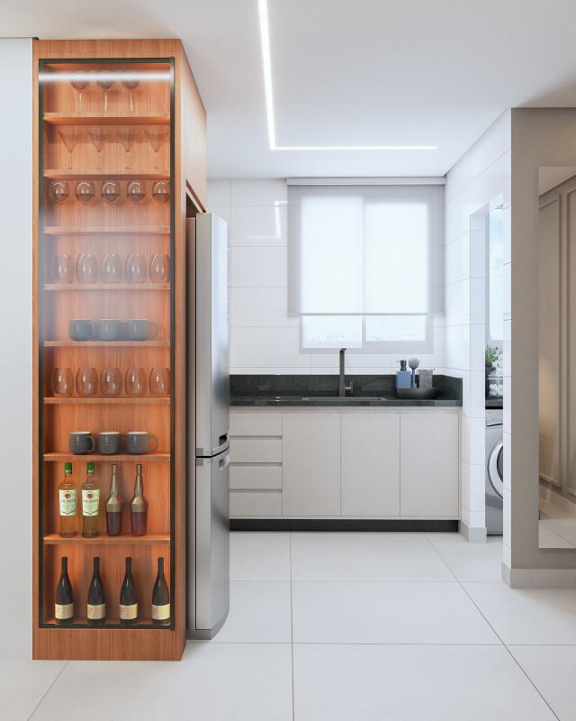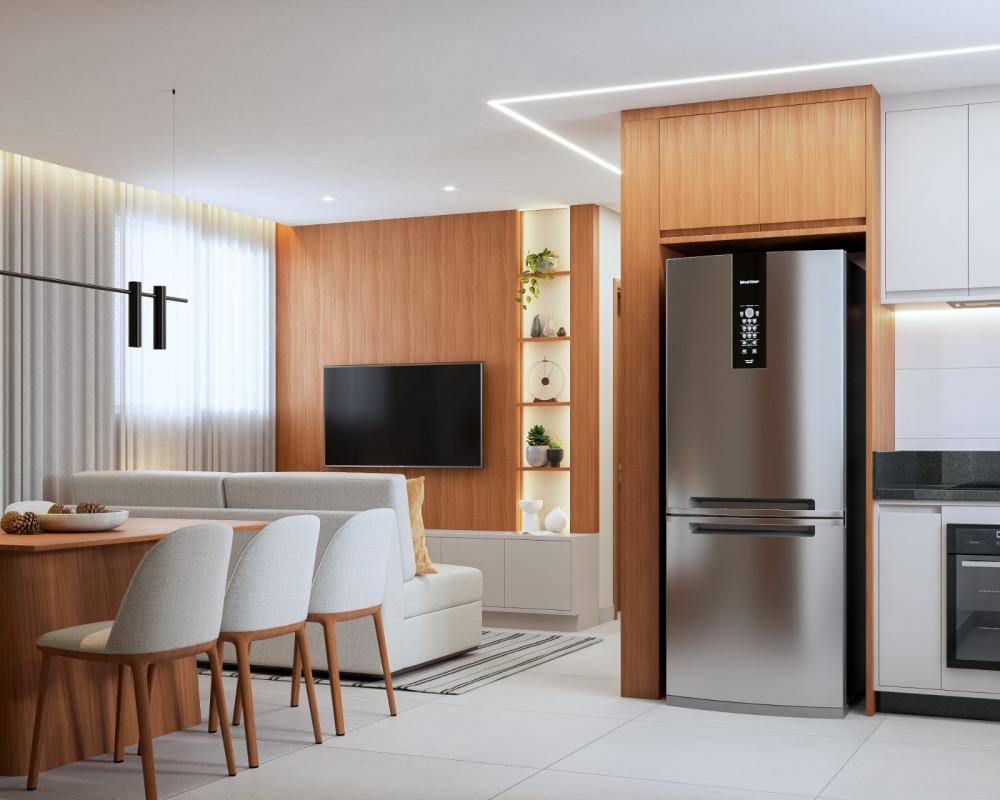 Sala, copa e cozinha totalmente integradas, criando um ambiente amplo, moderno e funcional. Essa configuração favorece a convivência e proporciona maior sensação de espaço, além de permitir que todos os ambientes se conectem de forma harmoniosa, ideal para o dia a dia da família e para receber amigos com conforto.