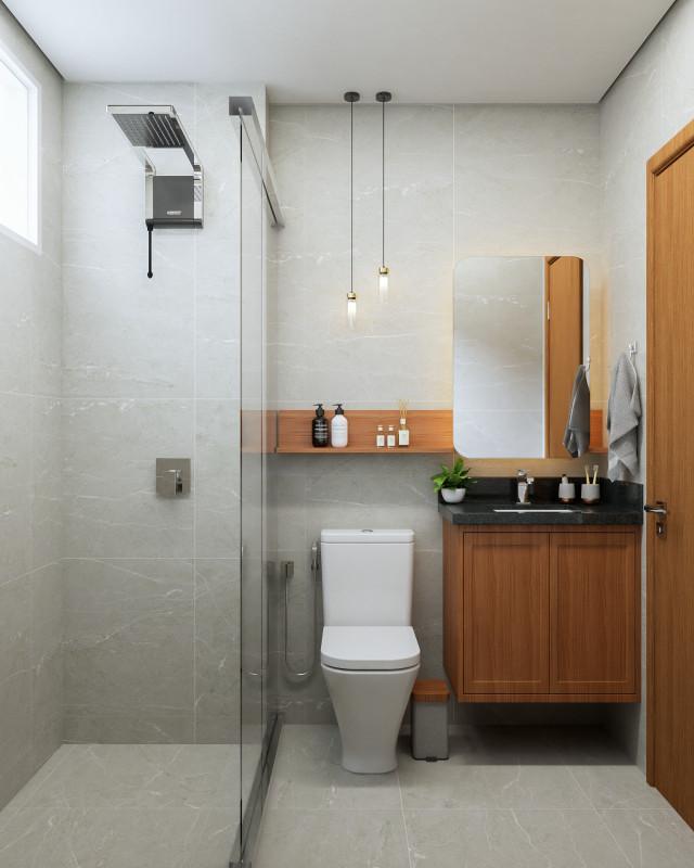 O espaço também dispõe de nicho embutido na parede dentro do box, oferecendo praticidade e organização para os itens do dia a dia.