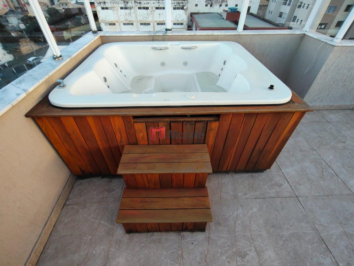 Na área externa, a cobertura dispõe de churrasqueira e jacuzzi, criando um ambiente perfeito para desfrutar com família e amigos.