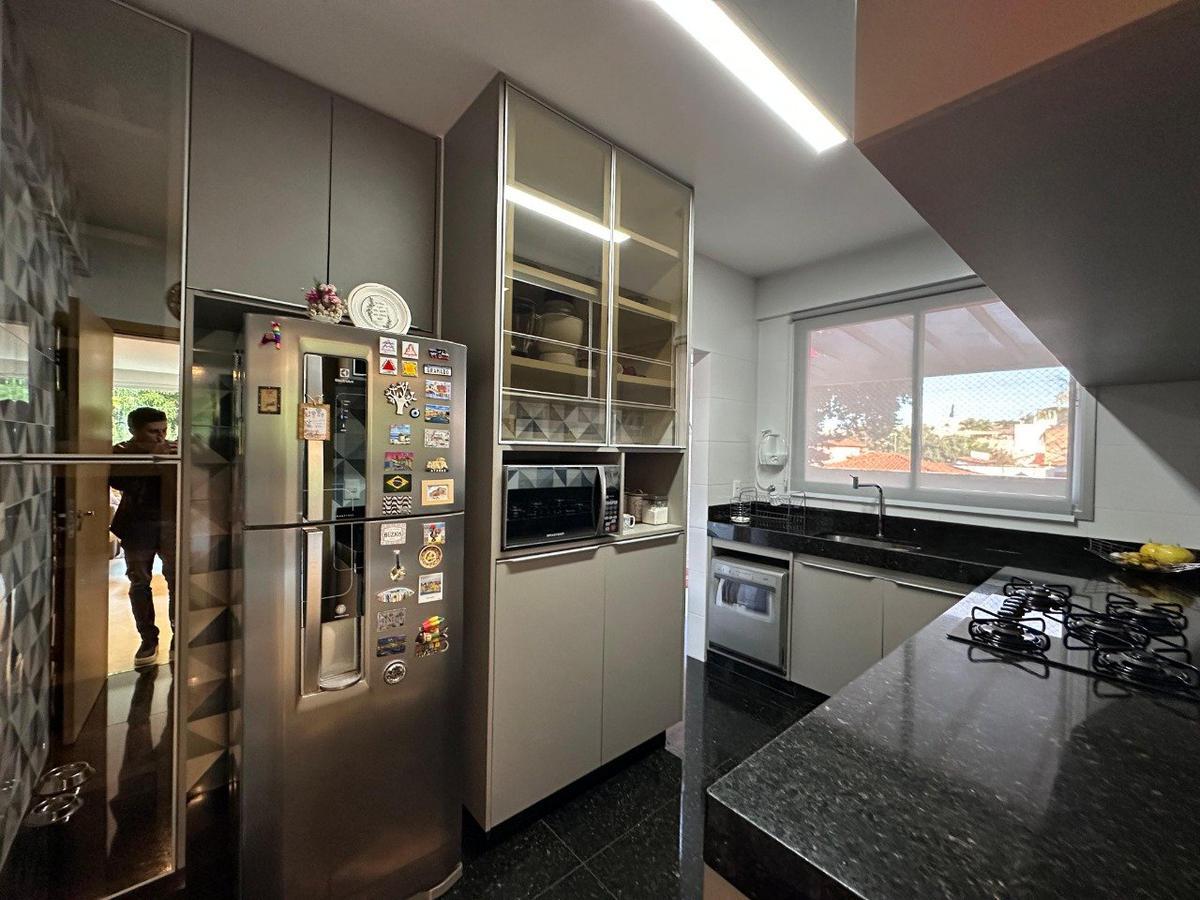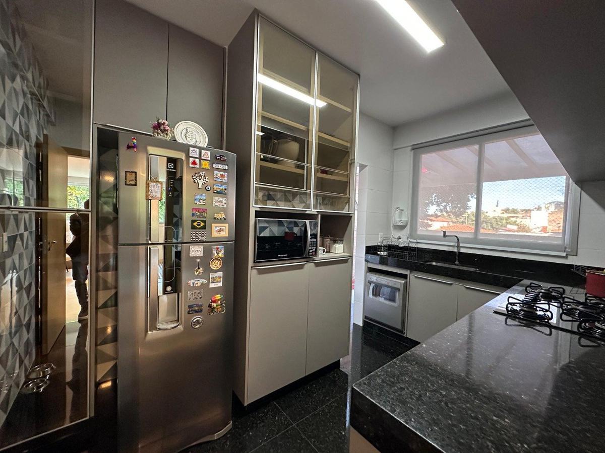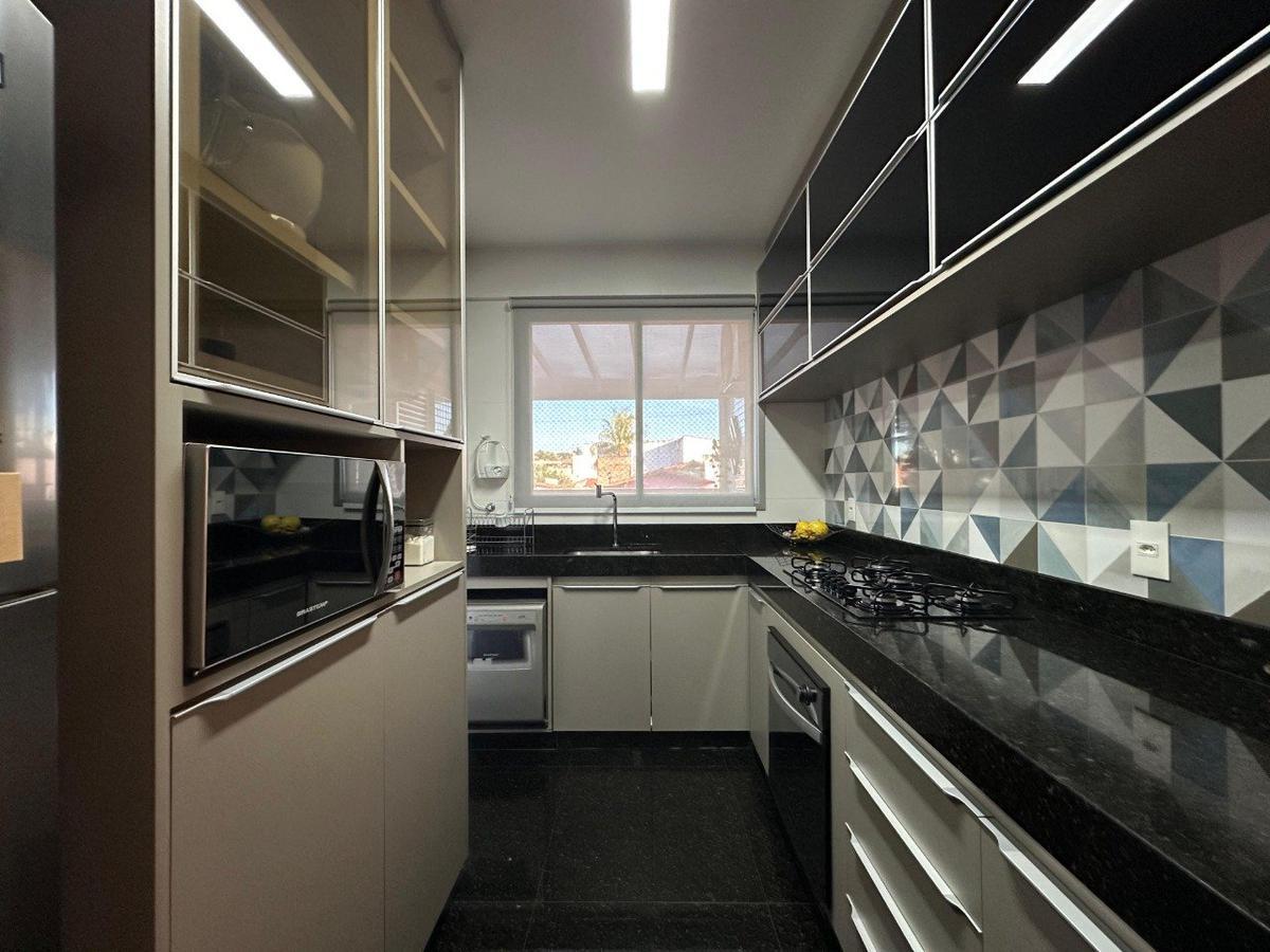 Cozinha repleta de armários planejados, bancada e piso em granito