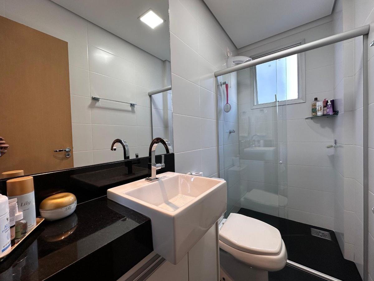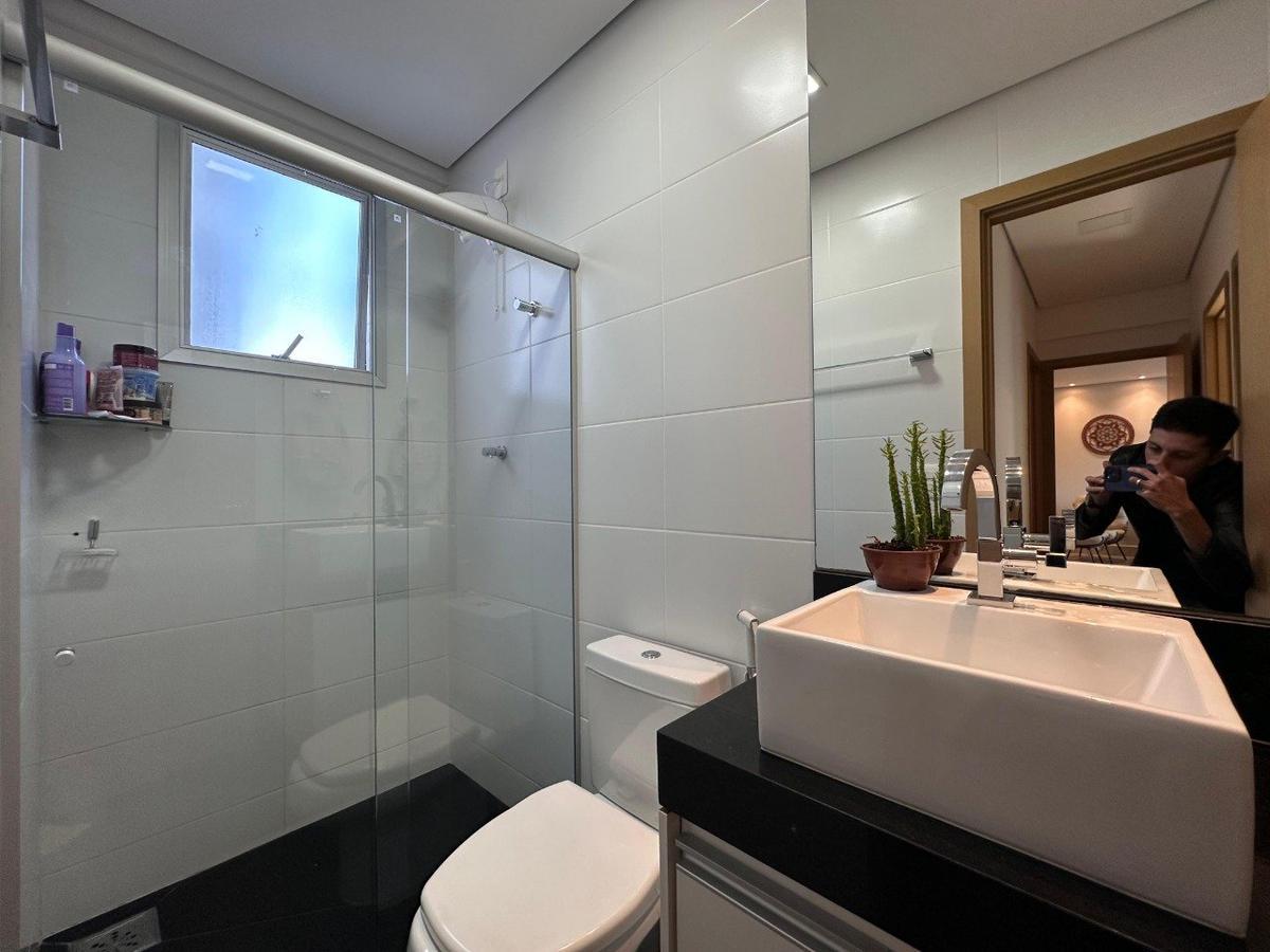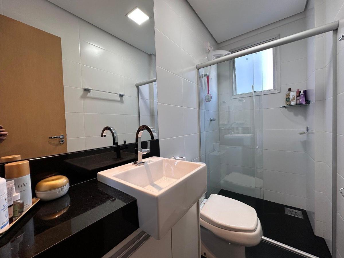 Banheiro social e suíte com box, espelho, bancada em granito e armário