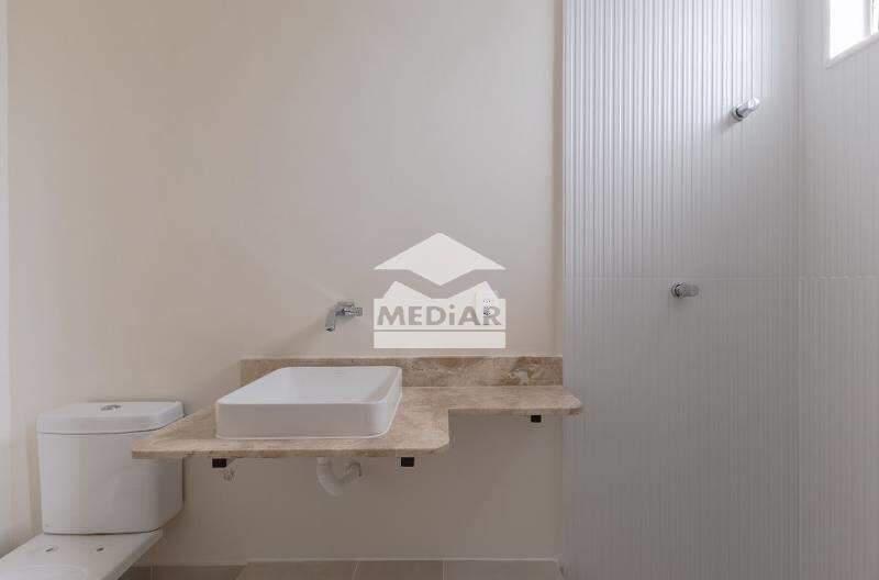Banheiro social com armário, espelho e box em blindex