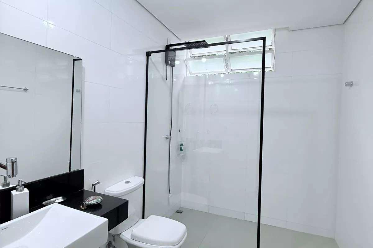 Banheiro social com bancada em granito, espelho e box em blindex