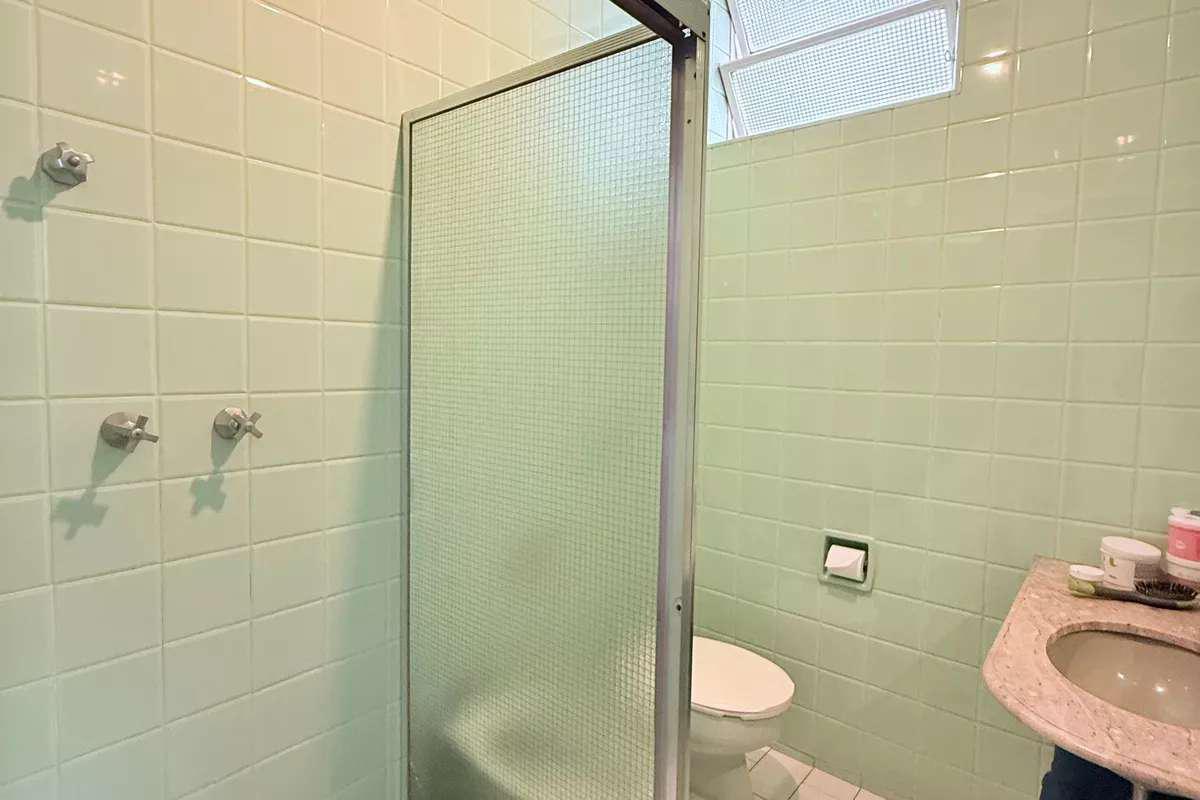 Banheiro social com bancada em granito, espelho e box em blindex