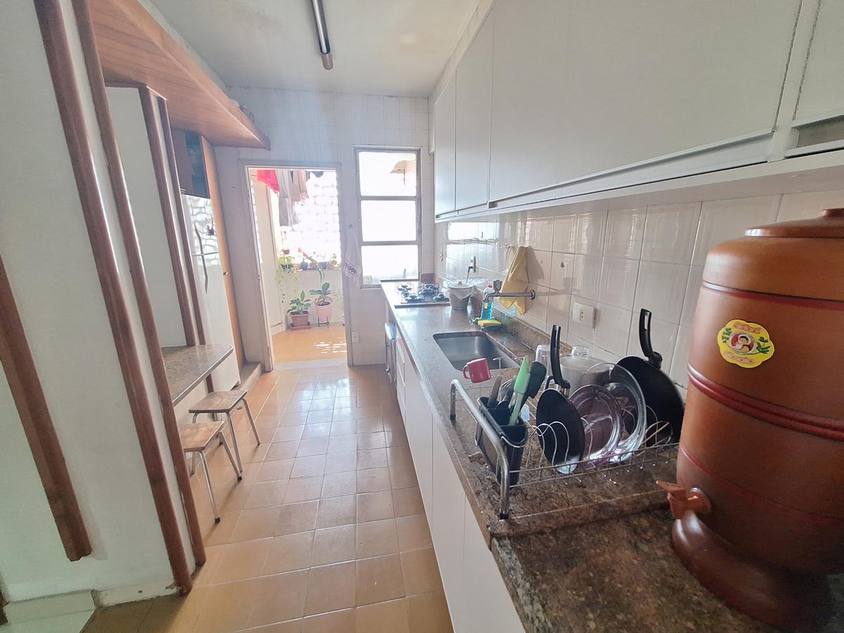 Cozinha com armários, bancada granito e piso cerâmica,