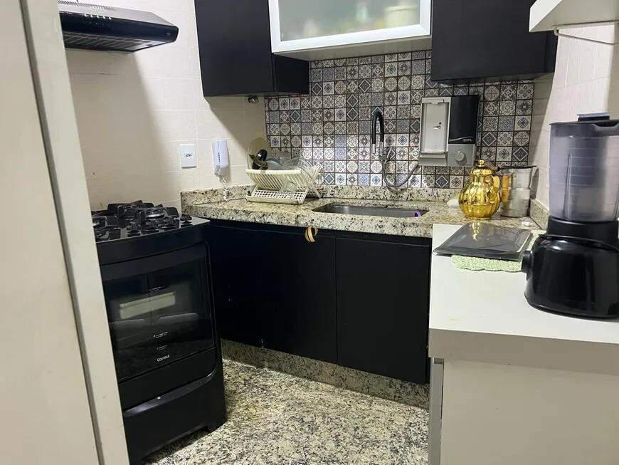 Cozinha com armários planejados, piso e bancada em granito.