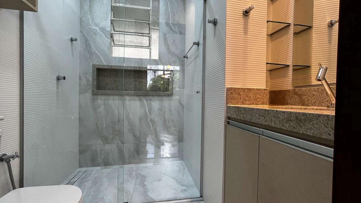 02 banhos sociais com armários, espelho, box blindex, piso em porcelanato e bancadas em granito.