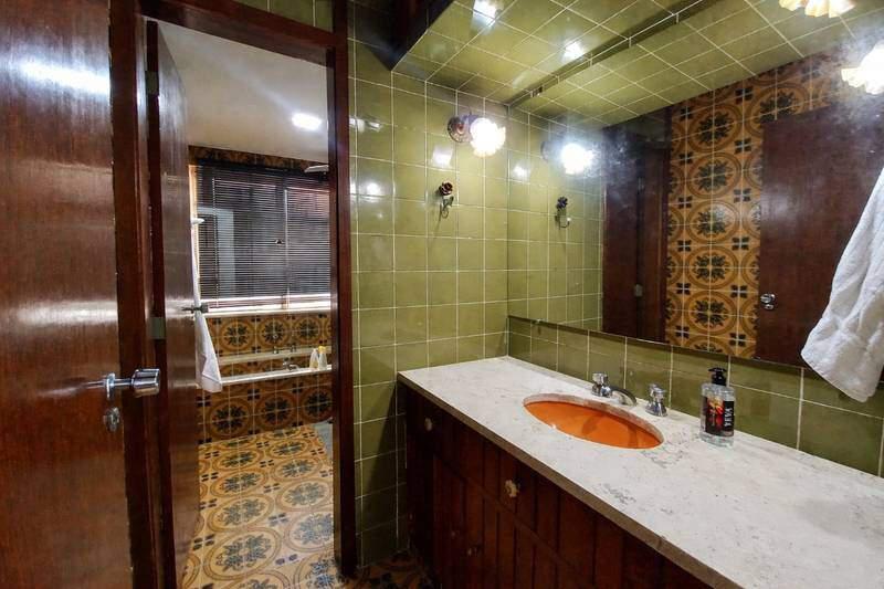 Banheiros (social e suíte) equipados com armários, espelhos e box em blindex.