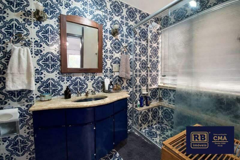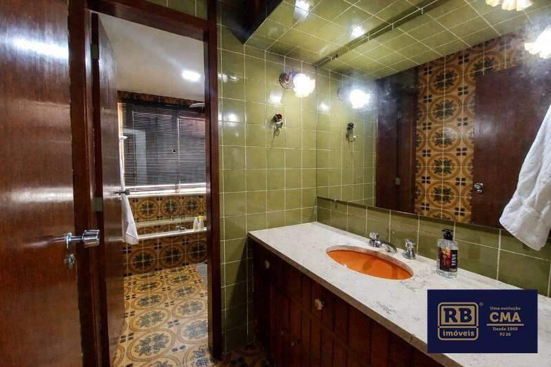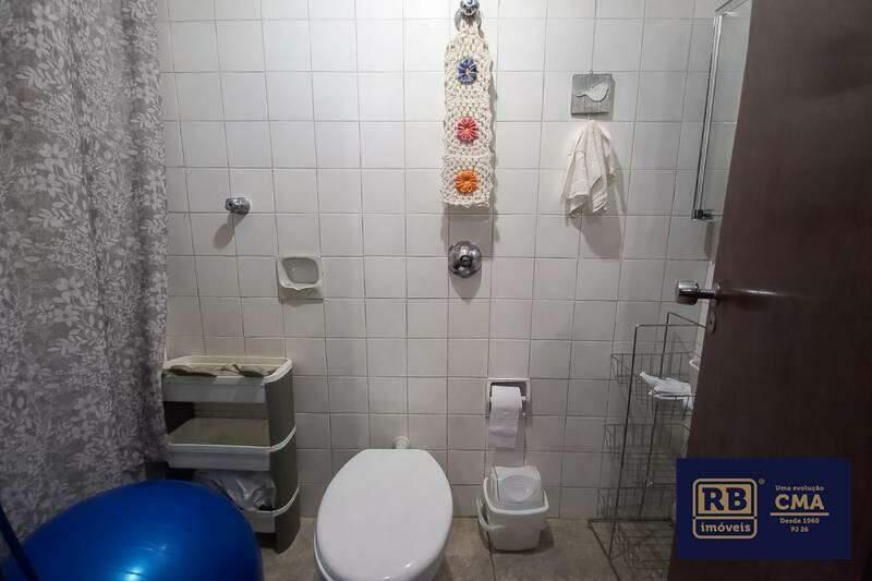 Banheiros (social e suíte) equipados com armários, espelhos e box em blindex.