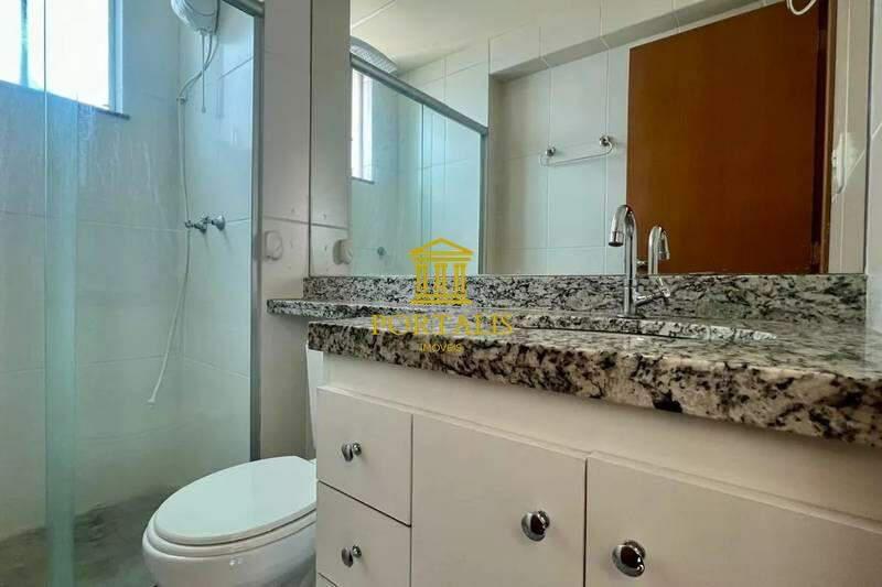 Banheiros (social e suíte) com bancadas em granito e piso em porcelanato.
