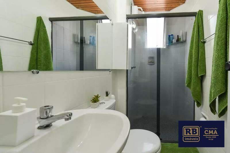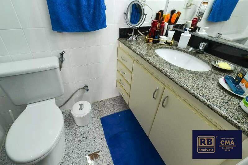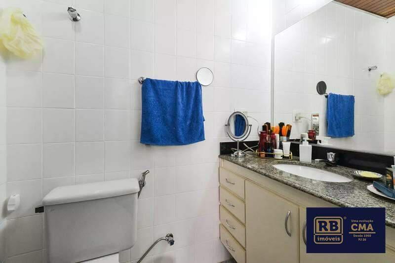 Banheiro social com pia em cuba de apoio, espelho, armários e box em blindex