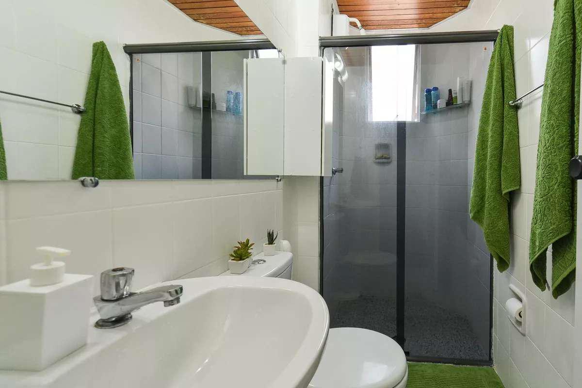 Banheiro social com pia em cuba de apoio, espelho, armários e box em blindex