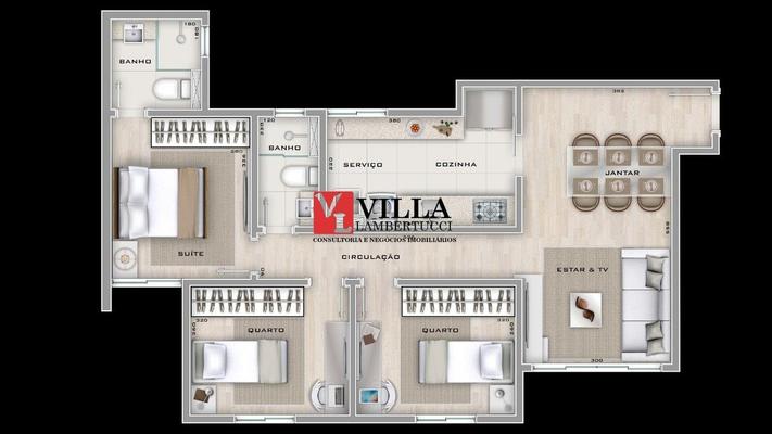 Apartamento com 74m² três quartos sendo uma suíte duas vagas de garagem, sala de estar e jantar, cozinha com área de serviço,