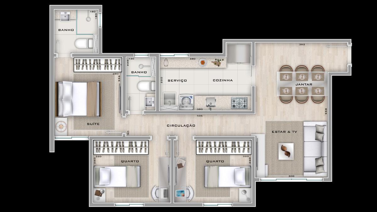 Apartamento com 74m² três quartos sendo uma suíte, três vagas de garagem, sala de estar e jantar, cozinha com área de serviço,